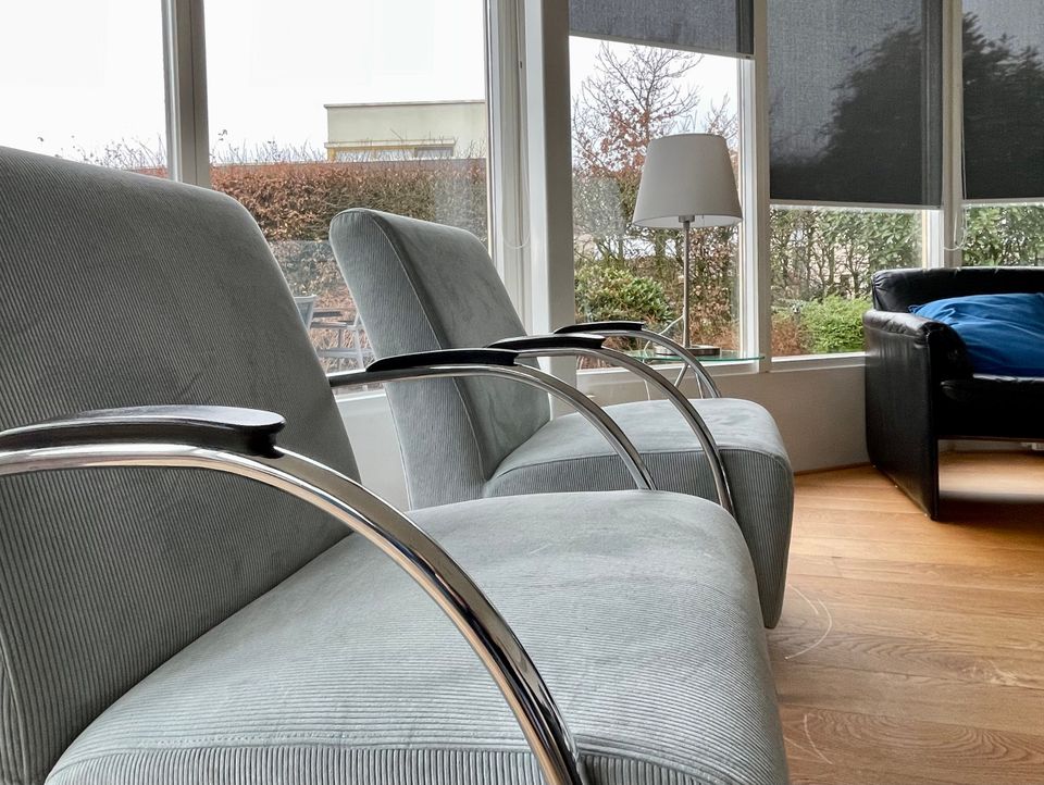 Das halbrunde Wohnzimmer mit vielen Fenstern bietet einen schönen Blick auf den Garten und das Wasser. Vom Wohnzimmer aus gelangen Sie durch die französischen Türen direkt in den sonnigen Garten.