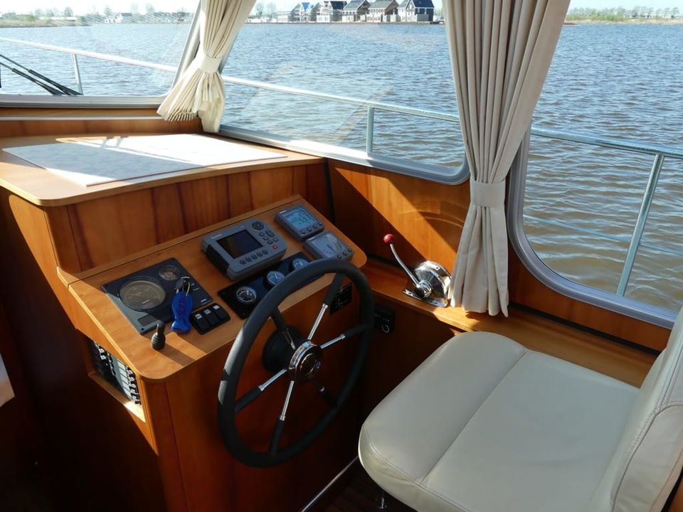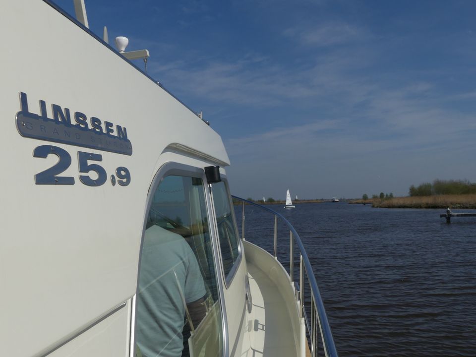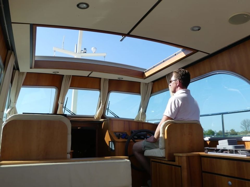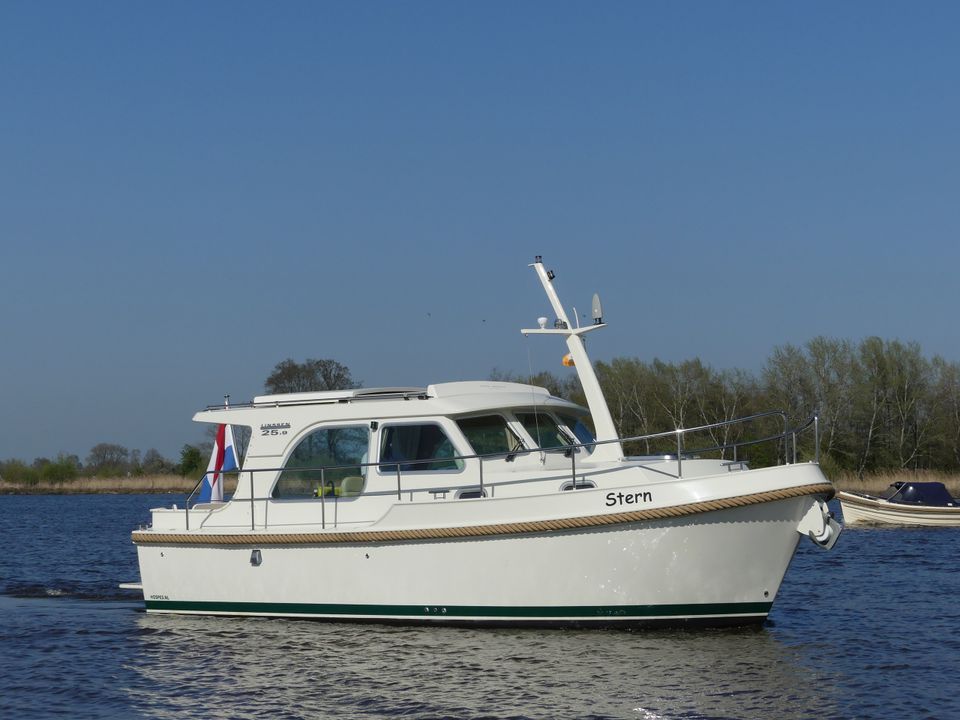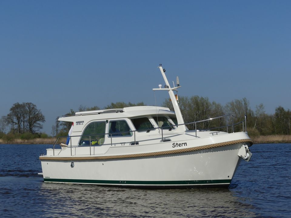 Das Luxus-Motorboot Linssen Grand Sturdy 25.9 Sedan Variotop ist mit einem großen verstellbaren Schiebedach ausgestattet. Dies bietet die Möglichkeit, ganz oder teilweise mit offenem Dach zu segeln, drinnen ist bei diesem Boot auch draußen. Die Linssen hat perfekte Segeleigenschaften und ist sehr luxuriös mit allen erdenklichen Optionen ausgestattet. Das Cockpit ist selbstlenzend, viel Stauraum und Landstromanschluss. Die Warmluftheizung macht es zu einem angenehmen Aufenthalt und Sie können auch bei weniger gutem Wetter weiter segeln und genießen. Die Durchfahrtshöhe von 2,37 mtr. macht dieses Schiff mit Hardtop wirklich einzigartig, sodass Sie unter allen Brücken in Friesland und den Niederlanden hindurchfahren können. Innenausstattung: Geräumige Eignerkabine mit viel Stauraum und großzügigem Doppelbett (1,60 x 2,00 m). Toilettenraum und separater Duschraum. Spülwasser wird im Abwassertank gesammelt. Die Kabine hat eine Stehhöhe von 1,95 mtr. Der Salon verfügt über eine geräumige Eckbank mit Lederbezug (die Eckbank kann zu einem zweiten Schlafplatz umgebaut werden). Küche komplett ausgestattet mit Inventar für 4 Personen. Kühlschrank 85 Liter, 2-Flammen-Herd, Wasserkocher und Kaffeemaschine. Boiler für Warmwasser, der Wassertank hat ein Fassungsvermögen von 270 Litern. Luxuriöser Sanitärraum mit elektrischer Toilette, Waschbecken, separatem Luxus-Duschraum mit Teakbank. Warmluftheizung, Einbaustrahler, Leselampen. LCD-TV mit Digitenne, Radio/CD-Player. Weitere Ausstattung; Echolot, Windmesser, 12-Volt-Anschluss, Batterieladegerät, Wechselrichter, Bugstrahlruder, Ruderstandsanzeige, Badeplattform mit Badeleiter. Victron Wechselrichter 220 V damit Sie beim Segeln voll mit Strom versorgt sind. Bettwäsche müssen Sie selbst mitbringen oder bei uns ausleihen. Kissen sind an Bord. Kartenplotter, Frieslandkarte und die schönsten Segelrouten sind an Bord.