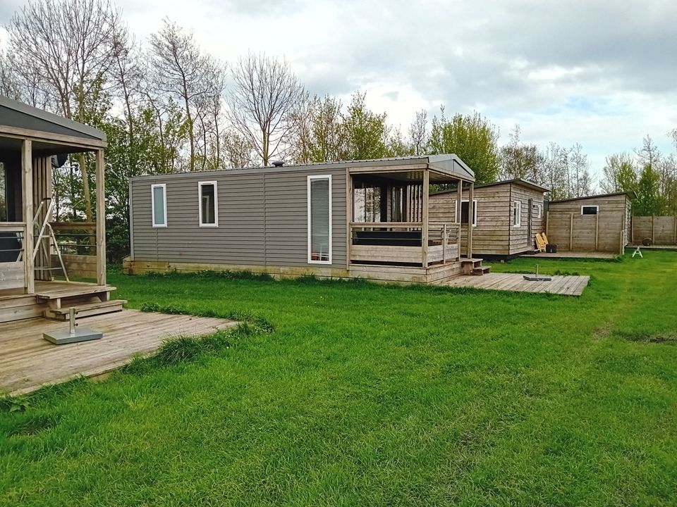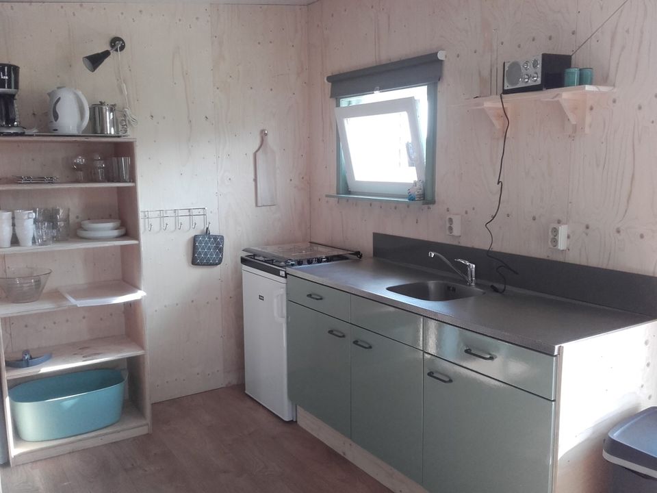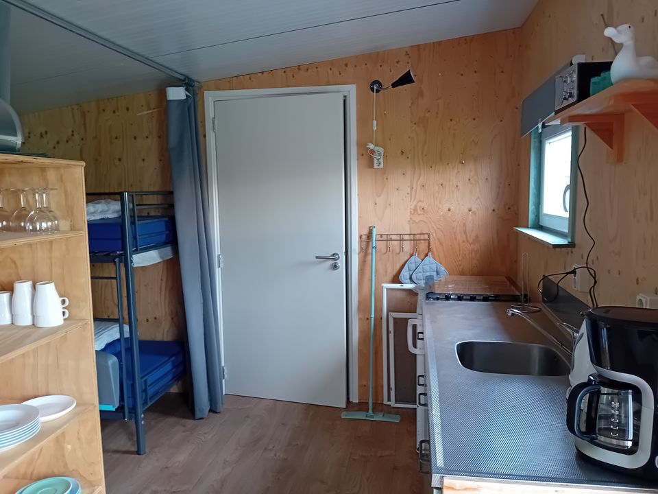 Willkommen in dieser gemütlichen Hütte von über 40 m2. Es ist gemütlich und gemütlich und verfügt über ein neues geräumiges Badezimmer! Es gibt eine offene Küche, die komplett mit Warmwasser, Gasherd, Kühlschrank, Kaffeemaschine und Wasserkocher ausgestattet ist. Die gemütliche Hütte verfügt über einen Essbereich mit zwei Sofas. Die Sitzecke verfügt über eine Bank mit Fußhocker und Fernseher (Satellit). Es gibt zwei Schlafzimmer. Die Räume können mit einem Vorhang verschlossen werden. Das erste Schlafzimmer verfügt über ein Doppelbett und das zweite Zimmer über zwei Etagenbetten. Die Fenster sind mit Moskitonetzen ausgestattet und die Vorhänge sind verdunkelnd. Sie verfügen über eine Holzterrasse mit ausreichend Privatsphäre, einem Picknicktisch und Gartenstühlen. Sie haben einen Blick auf einen Campingplatz und einen Hafen (direkt am Heegermeer). Kurz gesagt: optimale Gemütlichkeit des Campingplatzes, aber dennoch der Komfort von zu Hause.