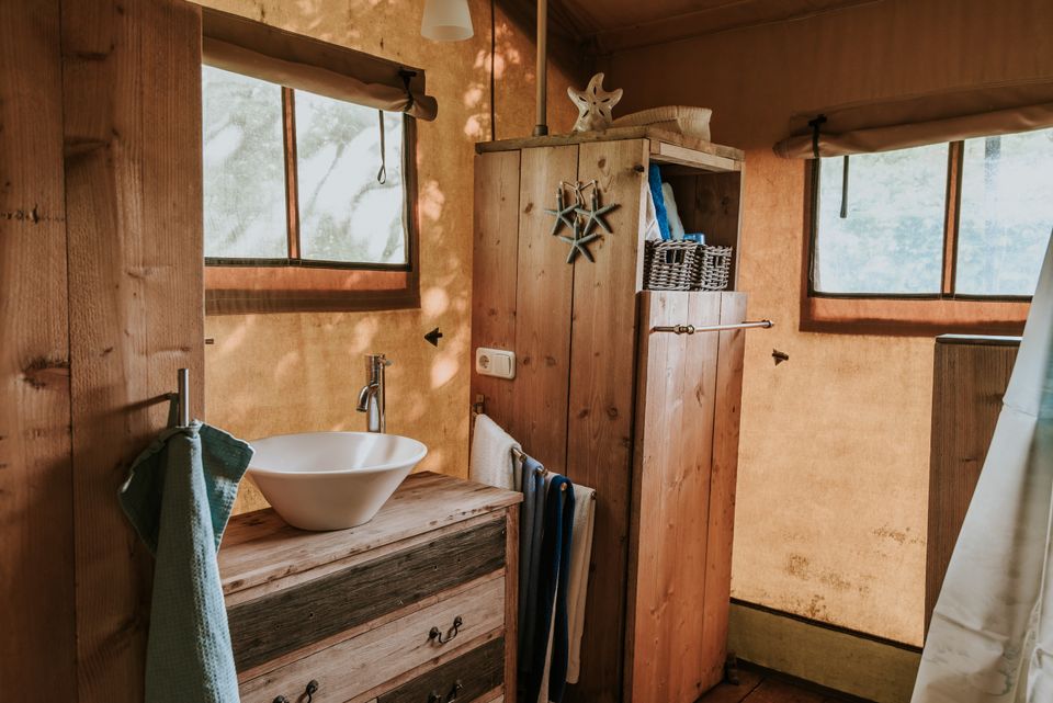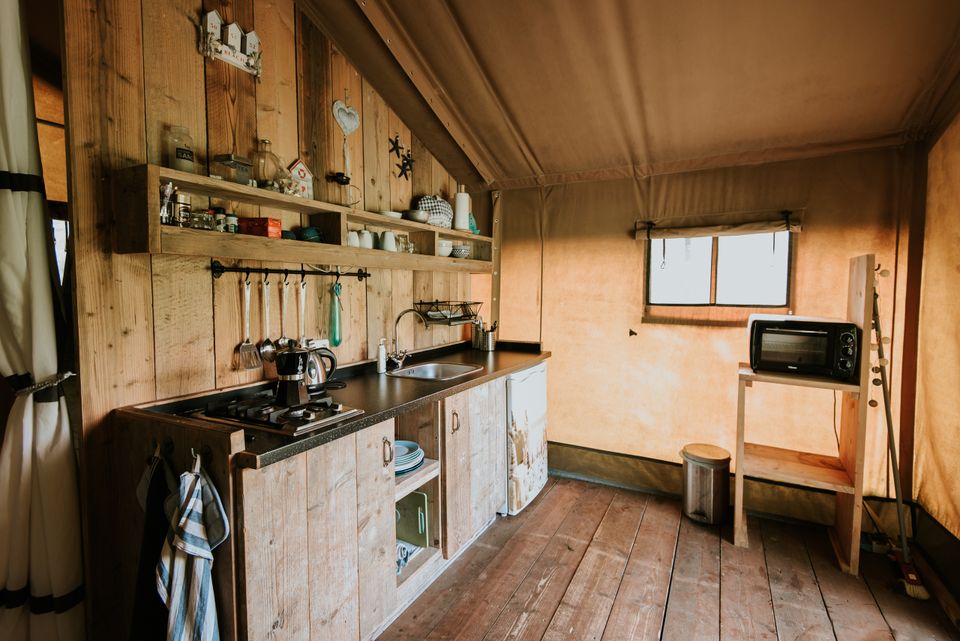 „On the Beach“ ist ein wunderschönes Safarizelt für zwei Personen. Das Zelt ist so dekoriert, dass Sie ganz in die Atmosphäre des Strandes eintauchen können. Es fühlt sich wirklich an, als würde man in einem Strandhaus übernachten. On the Beach verfügt über ein Doppel-Himmelbett, eine gute Regendusche, eine separate Toilette und eine voll ausgestattete Küche. Wenn der Abend kühl ist, können Sie bei Bedarf die warme Gasheizung einschalten. In der Nähe des Zeltes gibt es auch eine schöne Veranda, auf der Sie die Sonne genießen und gemeinsam speisen können.