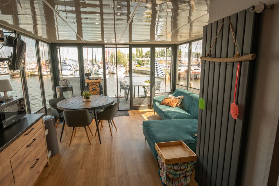 Macht Hausbootglück auch Sie glücklich? Dieses gemütliche Hausboot bietet Komfort für zwei bis vier Personen. Es gibt ein schönes Wohnzimmer mit einem schönen Sofa und einer gemütlichen Essecke. Die Küche ist klein, aber komplett ausgestattet! Hier kann man wunderbar kochen. Es gibt zwei Schlafzimmer mit bequemen Betten und auch das Badezimmer ist angenehm. Wenn das Wetter schön ist und Sie draußen sitzen möchten, können Sie zwischen zwei Terrassen wählen! Neben dem Wohnzimmer gibt es eine Terrasse, aber auch eine sehr schöne Dachterrasse! Oder springst du direkt ins Wasser?