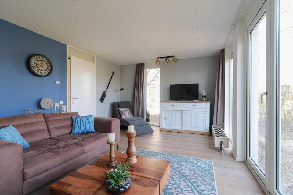 Der Bungalow „Schakel+“ ist ein luxuriöser Doppelbungalow für 5 Personen am Wasser. Das Wohnzimmer verfügt über Terrassentüren zum großen Garten mit Terrasse. Es gibt eine offene Küche mit Essbereich. Im ersten Stock befinden sich 3 Schlafzimmer und ein Badezimmer mit Badewanne, Dusche und 2. Toilette. Zwei Schlafzimmer verfügen über ein Doppelbett und das dritte Schlafzimmer über ein Einzelbett.