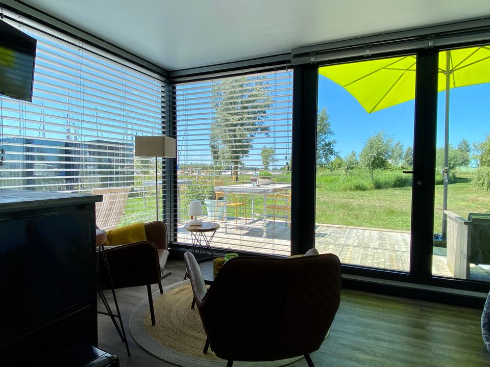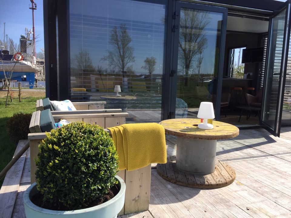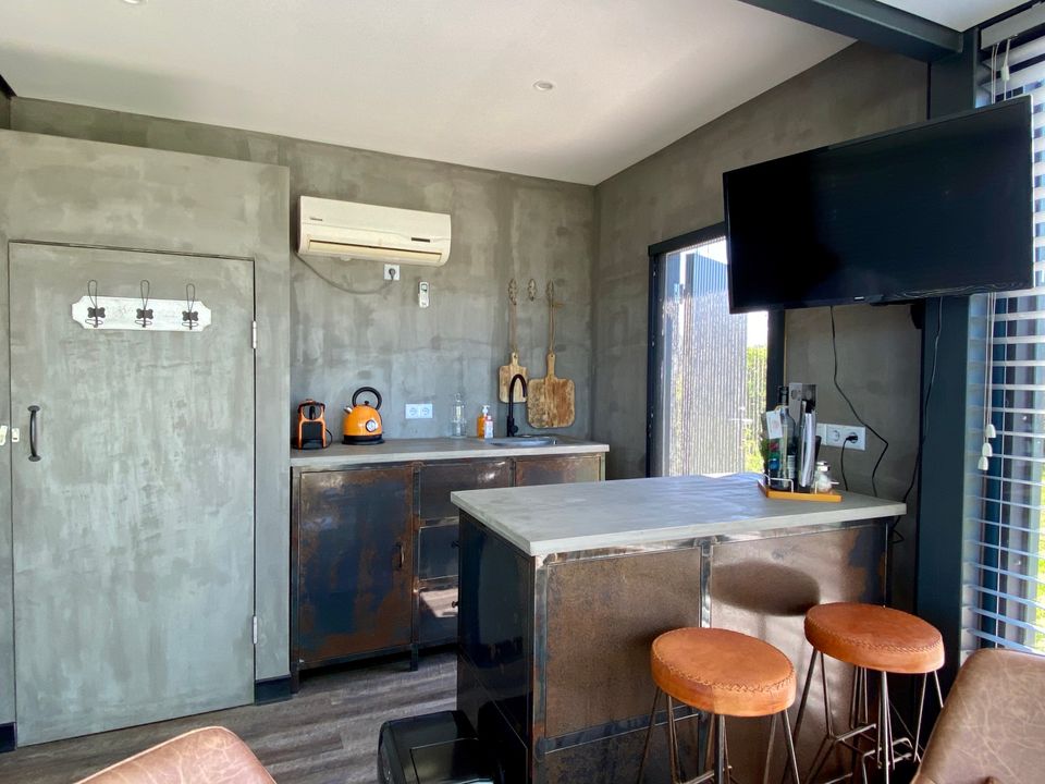 Dieser gemütliche Glamptainer - ein ehemaliger Schiffscontainer - ist perfekt für einen romantischen Aufenthalt zu zweit! Wenn Sie eintreten, sehen Sie sofort den gesamten Raum. Es gibt ein bequemes Kingsize-Bett, eine gemütliche Sitzecke mit bequemen Stühlen und eine Küchenzeile, in der Sie sich bequem eine Tasse Kaffee oder Tee zubereiten können. Der Glamptainer hat ein eigenes Badezimmer mit Dusche, Toilette und Waschbecken. Draußen ist eine Terrasse, auf der Sie mit einem Sonnenschirm wählen können, ob Sie die Sonne oder den Schatten der Umgebung genießen möchten.