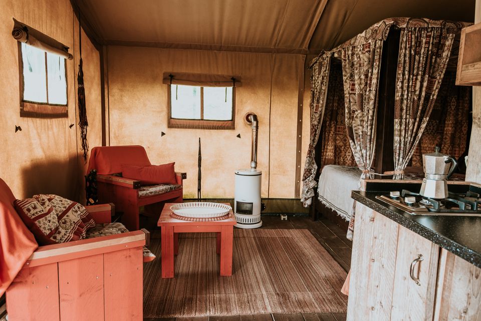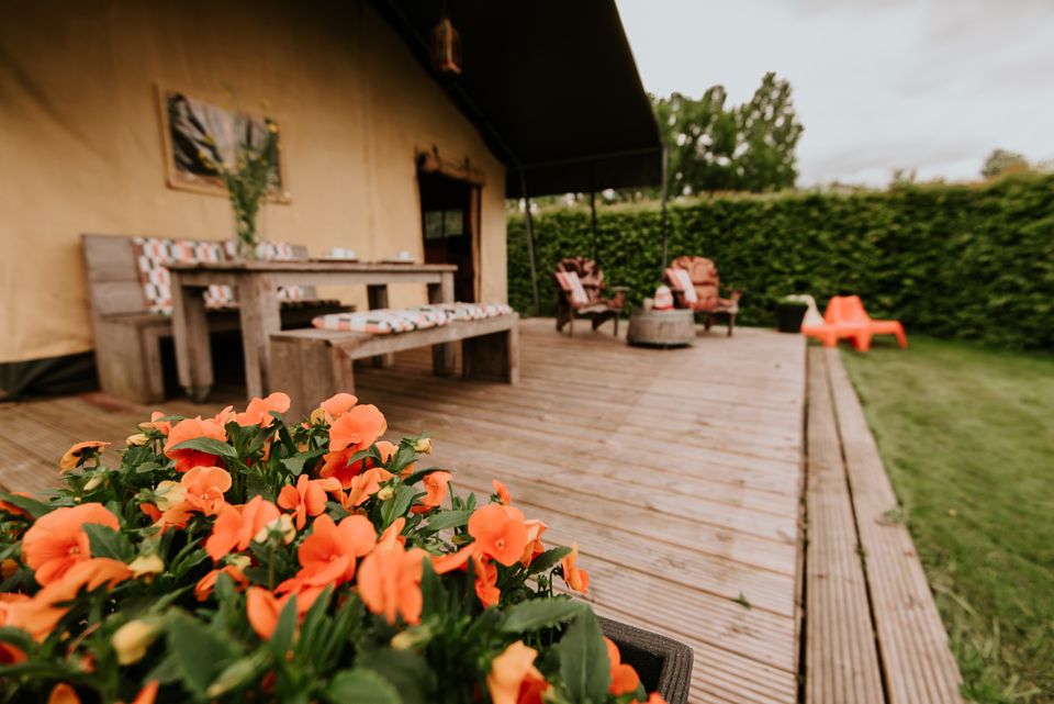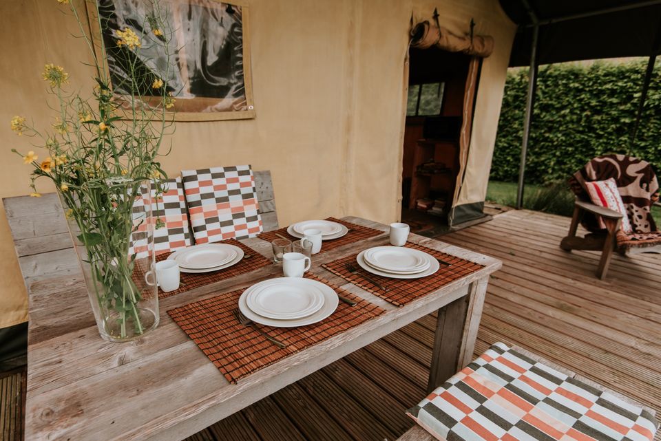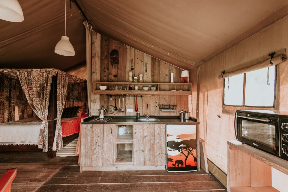 Im Safarizelt „Jenseits von Afrika“ tauchen Sie völlig in die Atmosphäre Afrikas ein, denn dieses Zelt ist im Kolonialstil eingerichtet. Dieses Safarizelt verfügt über ein Doppelbett, eine voll ausgestattete Küche, eine gute Regendusche und eine separate Toilette. An einem kühlen Abend können Sie die schöne Gasheizung nutzen. Vor dem Safarizelt gibt es eine schöne Veranda, auf der Sie draußen essen und die Sonne genießen können. Also ideal!