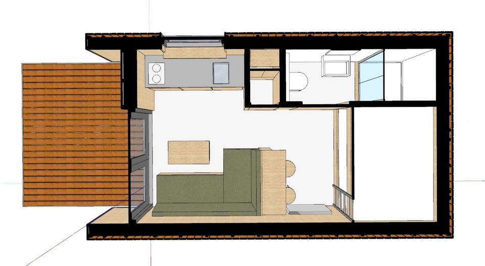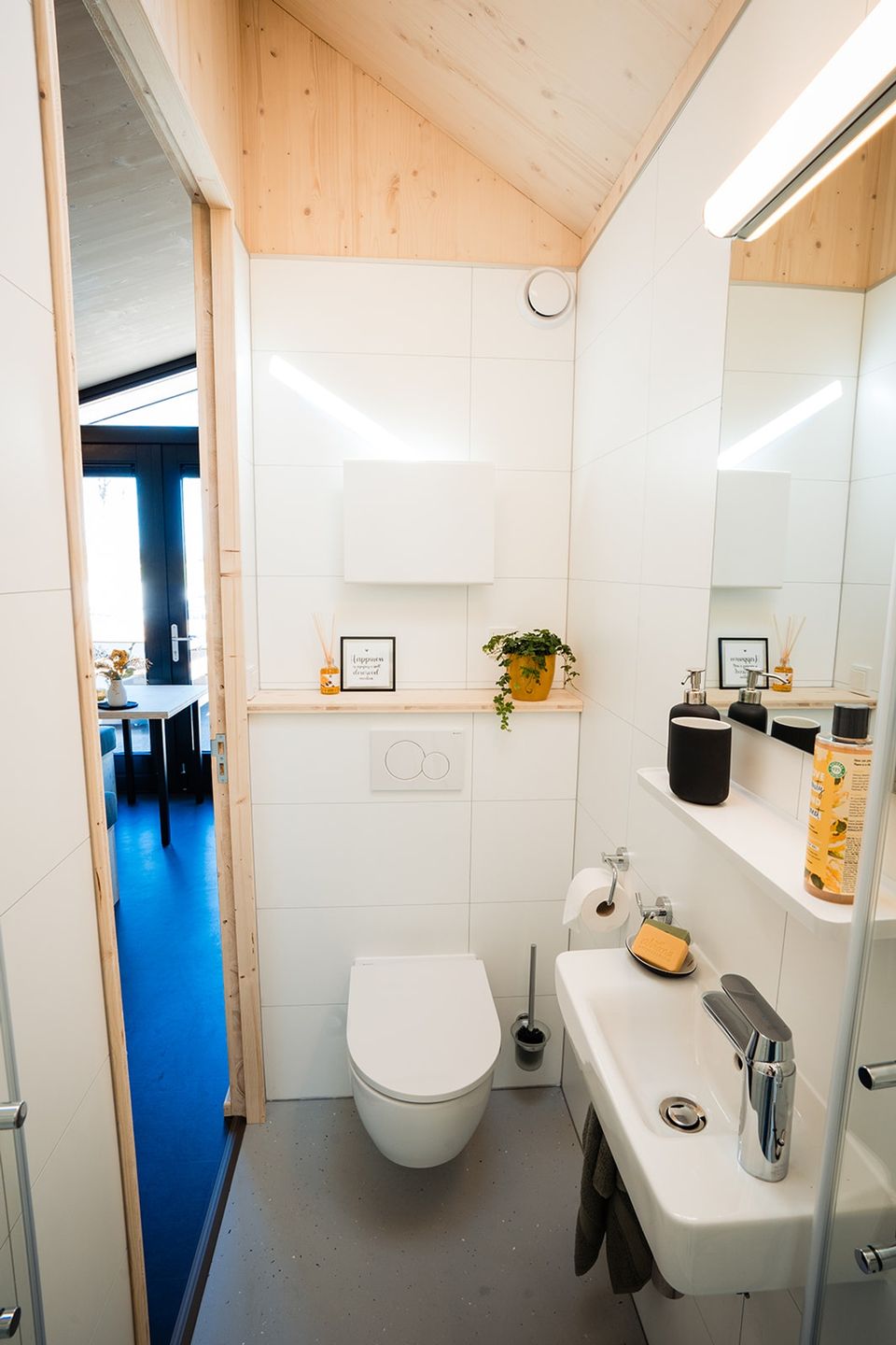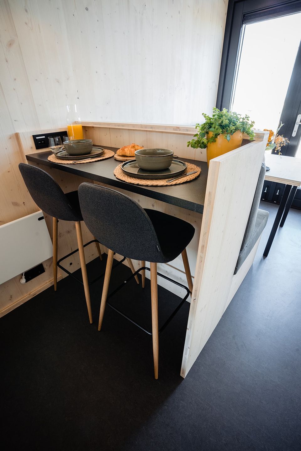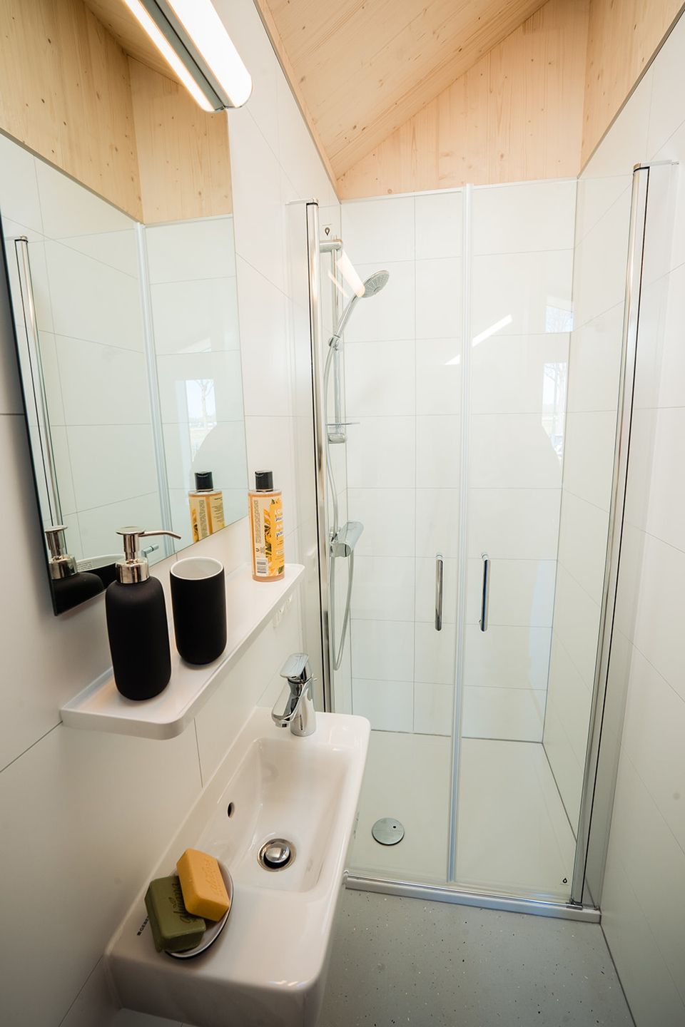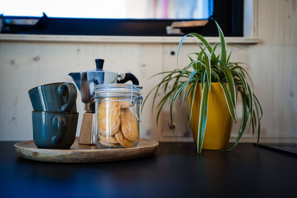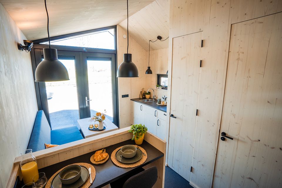 Jedes Ferienhaus hat einen offenen Studiocharakter und verfügt über ein eigenes Badezimmer mit Dusche und WC. Die Küche ist komplett ausgestattet mit Induktionskochfeld, Kühlschrank, Kaffeemaschine und Wasserkocher. Darüber hinaus finden Sie in den Küchenschränken fließendes Warm- und Kaltwasser sowie sämtliches notwendige Geschirr. Für ein gemütliches Essen gibt es im Innenbereich einen kleinen Barbereich und draußen auf der Veranda steht ein großzügiger Picknicktisch bereit.