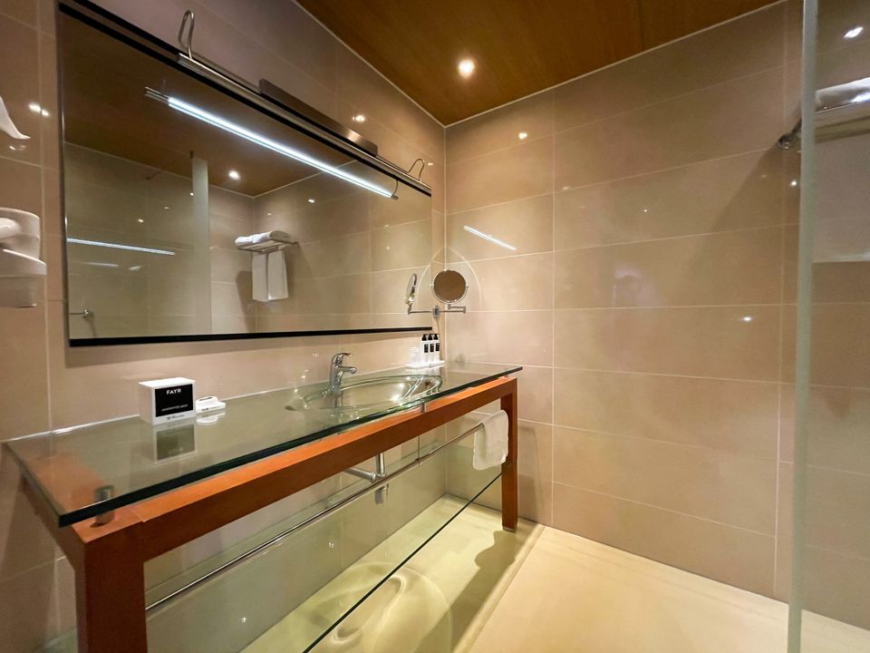 Unser Komfortzimmer ist ausgestattet mit einem Doppelbett, einem Badezimmer mit Regendusche, WC, Klimaanlage, Schreibtisch, Haartrockner, (Laptop-)Safe, TV, Espressomaschine, Wasserkocher, Bügeleisen mit Bügelbrett, Telefon und der Möglichkeit für Zimmerservice .