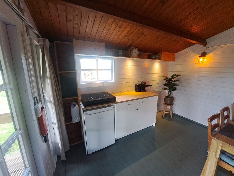Ein schönes und gemütliches Blockhaus für bis zu 6 Personen. Wenn Sie hereinkommen, befindet sich auf der linken Seite eine Küchenzeile mit Herd, Küchenutensilien, Besteck und Porzellan inklusive, Kaffeemaschine (Dolce Gusto), Kühlschrank und Induktionskochfeld für zusätzlichen Komfort. Etwas weiter links befindet sich außerdem ein Esstisch. Das Blockhaus verfügt über 2 Einzelbetten und 2 Etagenbetten. Diese Unterkunft verfügt über eine überdachte Terrasse, sodass Sie auch bei Regenwetter die Natur genießen können. Das Sanitärgebäude befindet sich in unmittelbarer Nähe der Blockhütte. Mitzubringen sind: Bettlaken, Bettbezug und Kissenbezug.
