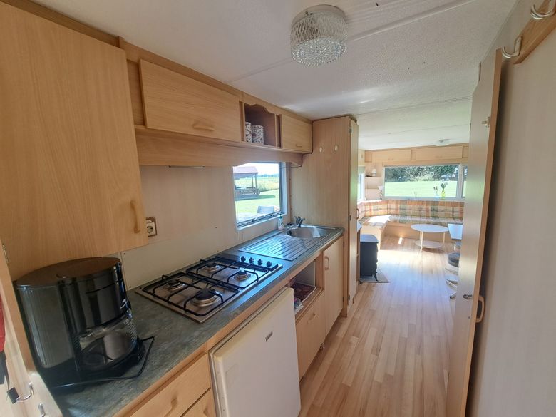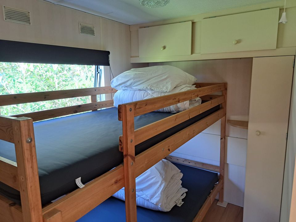 Dieses schöne Mobilheim ist für vier Personen geeignet. Es gibt zwei Schlafzimmer, eines mit einem Doppelbett und eines mit zwei Einzelbetten. Die Betten verfügen über Kissen und eine Bettdecke, Bettwäsche müssen Sie selbst mitbringen. Es gibt auch ein Badezimmer mit Dusche, Toilette und Waschbecken. Das Wohn- und Esszimmer dieses Mobilheims ist geräumig und verfügt über lange Sofas und einen separaten Essbereich. Die Küche ist kompakt, aber komplett und verfügt über einen Gasherd, einen Kühlschrank und eine Filterkaffeemaschine.