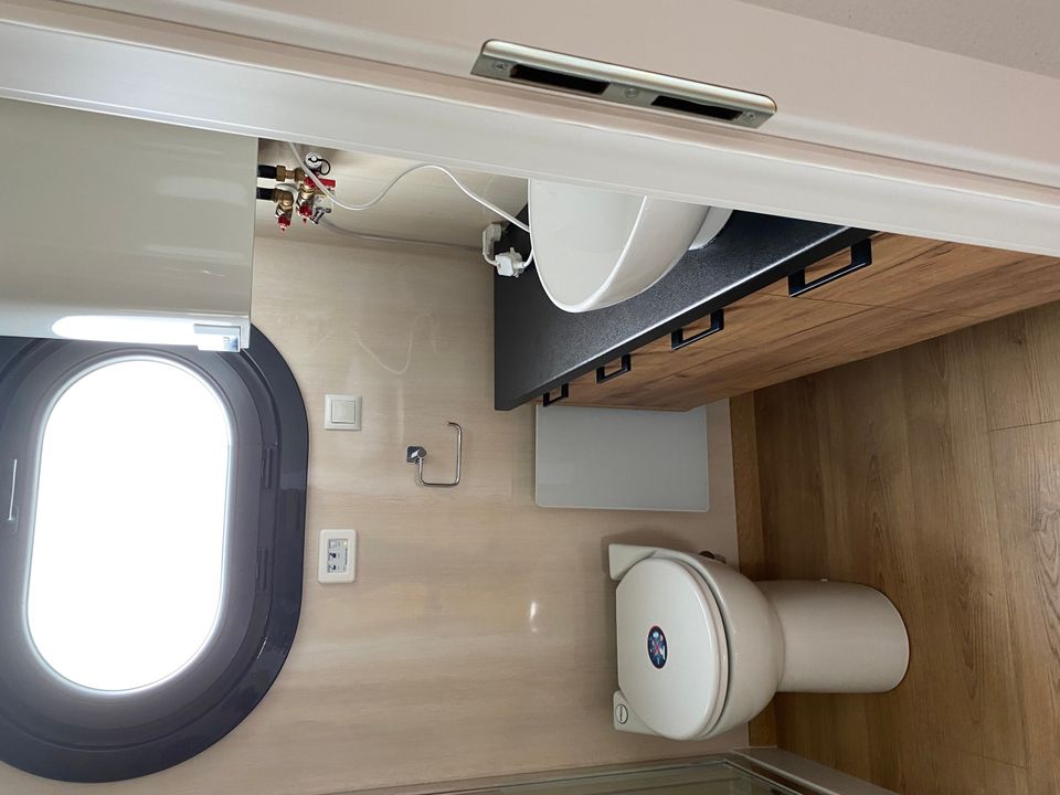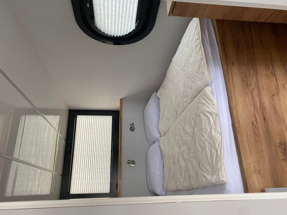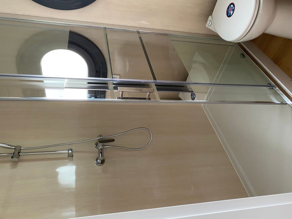 Wunderschönes Luxus-Hausboot Chill (Campi 400) mit geräumigem Wohnzimmer mit Lounge-Sofa, Esstisch mit 4 Stühlen und geräumiger Küche. Angrenzend das Badezimmer mit Dusche, Waschbecken und Toilette. 2 Schlafzimmer mit 140x200 Bett und Stauraum. Das Hauptschlafzimmer hat eine Tür zum Achterdeck. Auf dem Oberdeck befindet sich eine Liege (140x200) und Stühle.