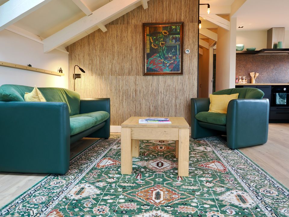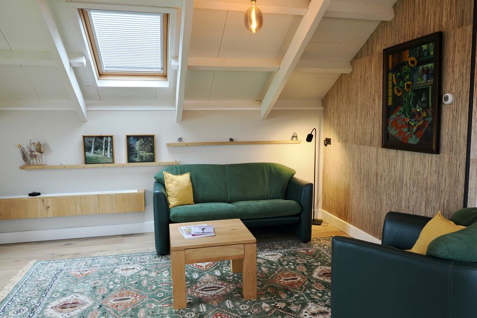 Sie betreten ein attraktives und geräumiges Zimmer mit Sitzecke mit TV und Radio. Der offene Raum verfügt über einen Essbereich mit Blick auf die Pferdeställe, die Felder und den Wald sowie eine voll ausgestattete Küche mit Geschirrspüler, Kühlschrank, Nespresso-Maschine und Induktionskochfeld. Im schönen Schlafzimmer finden Sie 2 einzelne Boxspringbetten, die auf Wunsch zusammengeschoben werden können. Gegenüber dem Schlafzimmer befindet sich das Badezimmer mit Regendusche, Toilette, Waschbecken und einer Waschmaschine (Nutzung bei einem Aufenthalt > 1 Woche). Vom Wohnzimmer aus, genau wie vom Essbereich, haben Sie eine schöne Aussicht und blicken auf das Ackerland, den Wald und den Pool. Am Pool können Sie auf den Relaxsesseln entspannen oder selbst ein erfrischendes Bad nehmen.