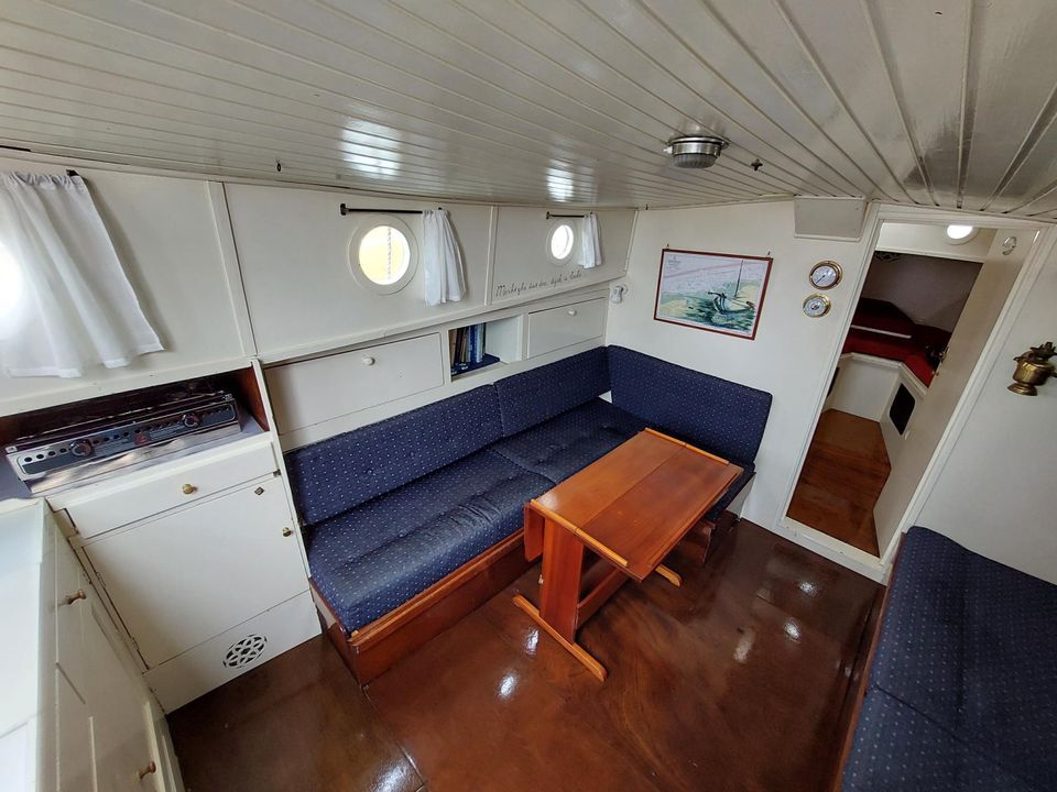 Steigen Sie an Bord der wunderschönen Familien-Zeeschouw mit geräumigem Cockpit. An Bord der Catharina ist es sehr gemütlich. Im Bug befinden sich zwei geräumige Kojen. Durch ein Verbindungsstück wird daraus ein geräumiger Drei-Personen-Schlafplatz. In der Kabine gibt es zwei große Schlafsofas. An Bord gibt es außerdem eine Küche mit Kühlschrank, Herd, Heizung und Toilette. Das Schiff ist leicht zu segeln und verfügt neben einer normalen Fock auch über eine Fock und eine Butterfock.