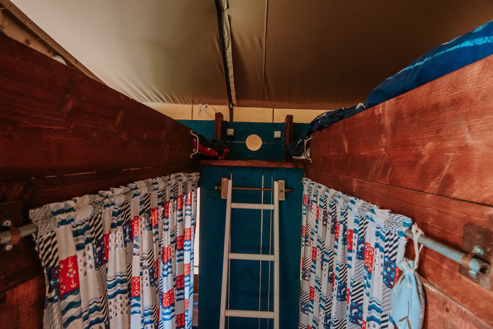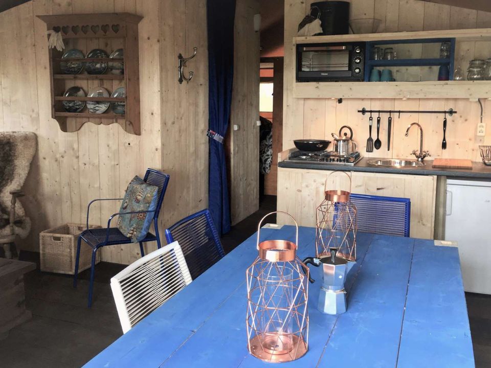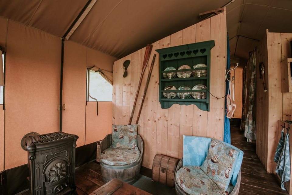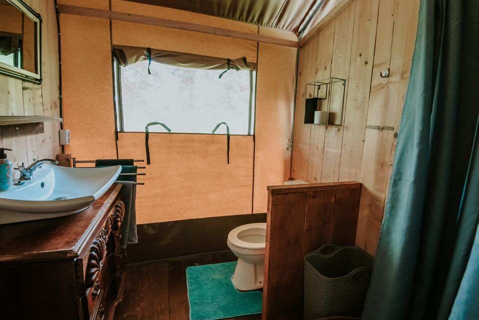 „The Titanic“ ist ein wunderschönes großes Safarizelt für bis zu 7 Personen. Das Zelt ist in fröhlichen blauen Atmosphären dekoriert und mit allen Annehmlichkeiten ausgestattet. Es gibt ein Doppelbett, ein Etagenbett, drei Einzelbetten, eine Regendusche, eine separate Toilette und eine voll ausgestattete Küche. Wenn es abends kalt ist, gibt es auch eine schöne Gasheizung, die eingeschaltet werden kann. Vor dem Safarizelt gibt es auch eine schöne Veranda, auf der Sie in entspannten Stühlen sitzen können. Dies ist das ultimative Ziel für eine größere Gruppe.