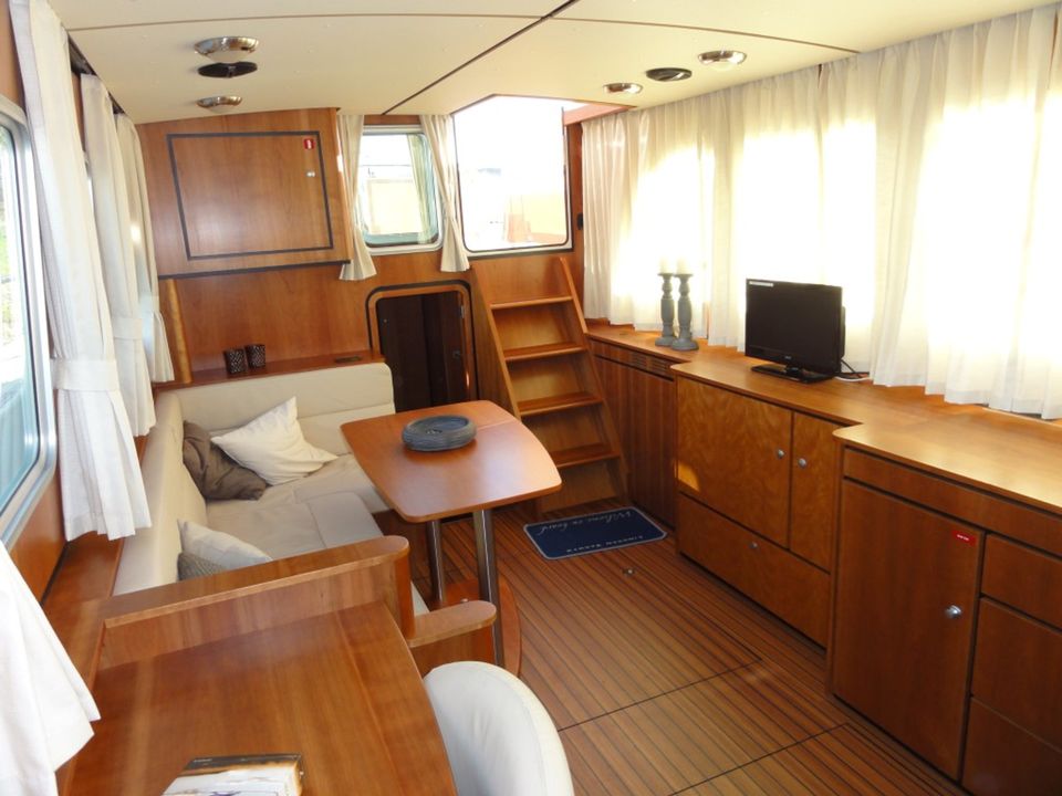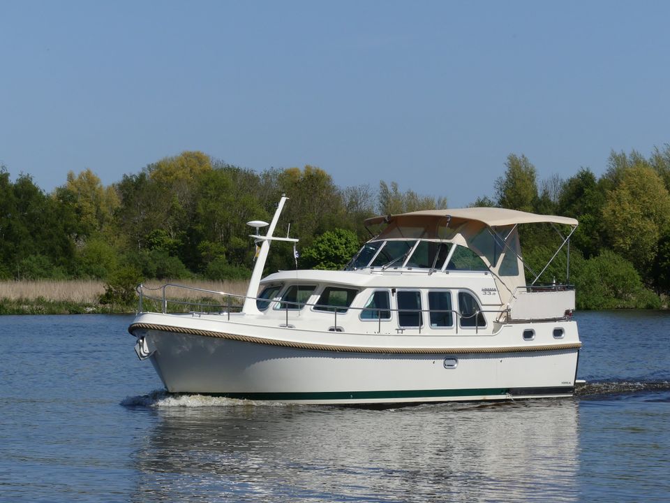Eine Linssen Grand Sturdy 33.9 AC „La Meuse“ mieten? Sie können dieses luxuriöse und voll ausgestattete Motorboot für vier Personen mieten (mit der Option auf zwei zusätzliche Schlafplätze). Dieser Typ ist mit einem Steuerstand auf dem Deck ausgestattet. Von diesem rundum verglasten Deck lässt es sich wunderbar segeln und man hat immer eine gute Sicht auf das Wasser. Das Schiff fährt ruhig und die Ruhe und Weite der wunderschönen friesischen Natur bescheren Ihnen das ultimative Urlaubserlebnis! Sie können das Luxuszelt nach eigenem Ermessen ausrichten und an das aktuelle Wetter anpassen. Bei sehr heißem Wetter sorgt das zusätzliche Bimini für Komfort und Schatten. An Bord haben Sie viel Platz und Privatsphäre durch die zwei separaten Schlafzimmer mit eigenen Sanitäranlagen. Dieses komfortable Motorboot verfügt über perfekte Segeleigenschaften und ist mit einem Geschwindigkeits- und Tiefenmesser am Log-/Kartenplotter ausgestattet. Das Bugstrahlruder unterstützt Sie beim Anlegen, Wegfahren oder Manövrieren in engen Gewässern. Sie können diese Linssen Grand Sturdy 33.9 problemlos vom Kapitänssitz aus bedienen. An Bord warten die schönsten Segelrouten und Gewässerkarten auf Sie. Das Schiff verfügt sowohl über einen 12-Volt- als auch einen 220-Volt-Anschluss, sodass Sie unterwegs immer Strom haben. Sie nutzen den Landstromanschluss, wenn Sie in einem der vielen Häfen in Friesland und den Niederlanden festgemacht haben. Die Warmluftheizung sorgt für einen angenehmen Aufenthalt und Sie können auch bei weniger schönem Wetter weiter segeln und genießen. Selbstverständlich sind Radio und LCD-Fernseher mit Digitenne in HD-Qualität vorhanden. Die Radiolautsprecher befinden sich ebenfalls draußen auf dem Deck. Über das Deck gelangt man zur Badeplattform. Es gibt auch eine (Außen-)Dusche mit heißem und kaltem Wasser.