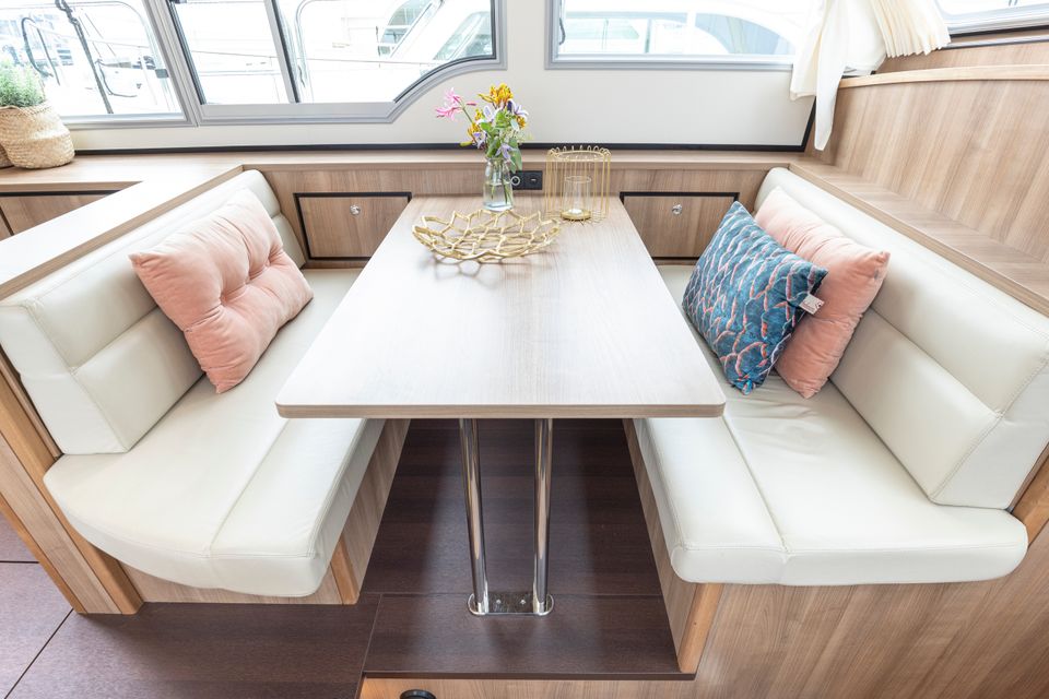Der Innenraum zeichnet sich durch eine raffinierte Gestaltung aus Kirschholz und luxuriösen Materialien wie Corian-Platten und Leder in einer hellen, geschmackvollen Farbgebung aus. Gegenüber der Küche befindet sich ein schöner Essbereich (Essecke) mit viel Licht. An Bord gibt es eine Nespresso-Maschine. Der Salon ist sehr geräumig und hell und bietet ausreichend Platz für 6 Personen. Im Salon gibt es einen Fernseher mit Apple-TV-Receiver. An Bord dieser Yacht gibt es einen Generator und eine Klimaanlage. Das Achterdeck ist aus echtem Teakholz gefertigt, was der Yacht einen luxuriösen nautischen Charme verleiht. An Deck gibt es reichlich Sitzgelegenheiten auf dem festen Sofa mit schönen Kissen und das Achterdeck kann mit einem extra großen Cabrio-Zelt rund um das Sofa komplett geschlossen werden. Das Achterdeck ist beheizbar, sodass Sie bis in die frühen Morgenstunden bequem draußen sitzen können.