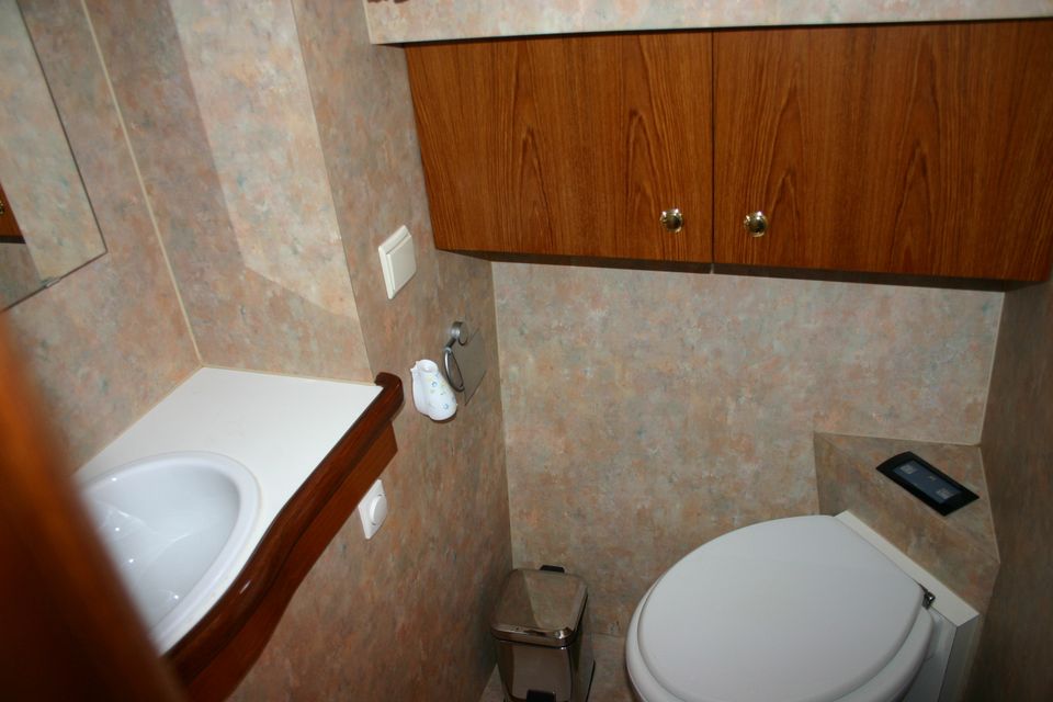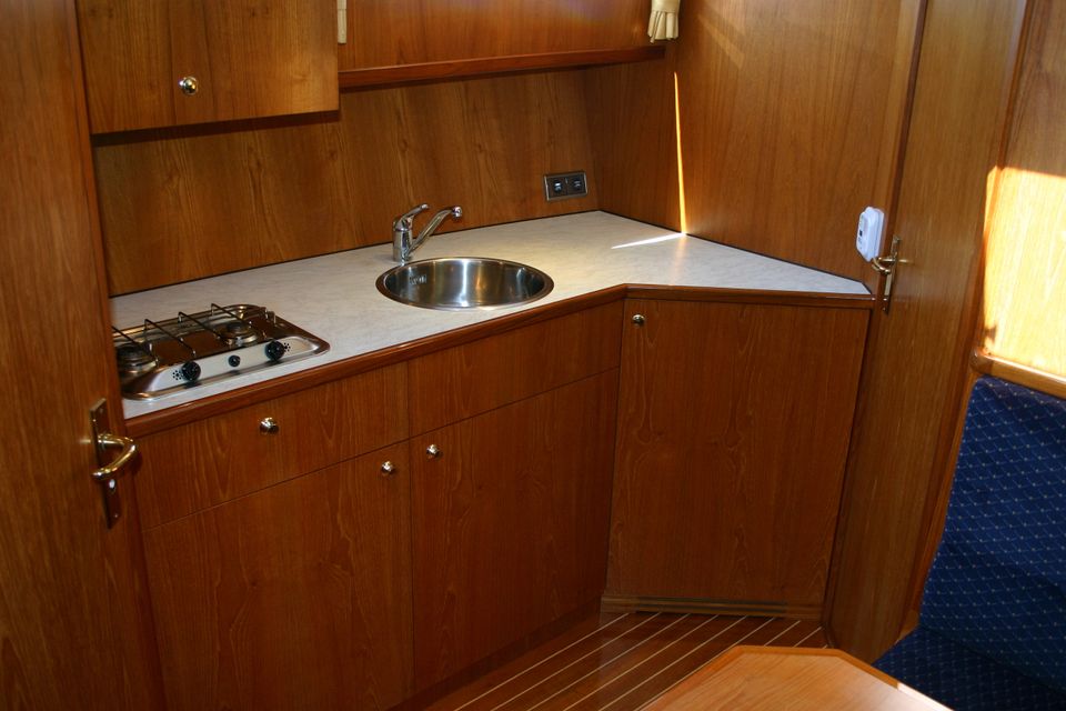 Layout: In der vorderen Kabine können Sie bequem in einem französischen Bett schlafen, umgeben von viel Schrankraum. Die Küche ist komplett für 2 Personen ausgestattet und verfügt über einen 2-Plattenherd, Kühlschrank, 75-Liter-Boiler, Kaffeemaschine und das nötige Inventar. In der Lounge stehen Ihnen eine geräumige Sitzecke, ein Fernseher und ein Radio zur Verfügung. Das Badezimmer ist mit einer Dusche, einem Waschbecken und einer elektrischen Toilette ausgestattet.