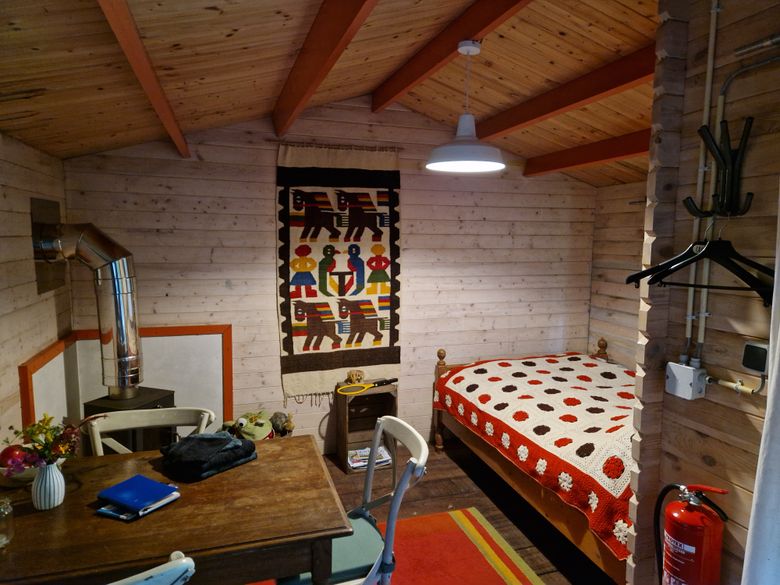 De trekkershut is knus en praktisch ingericht. Hier slaap je omringd door groen, vogels en stilte. Je kunt maximaal drie nachten verblijven, precies lang genoeg om op te laden en weer verder te trekken.
