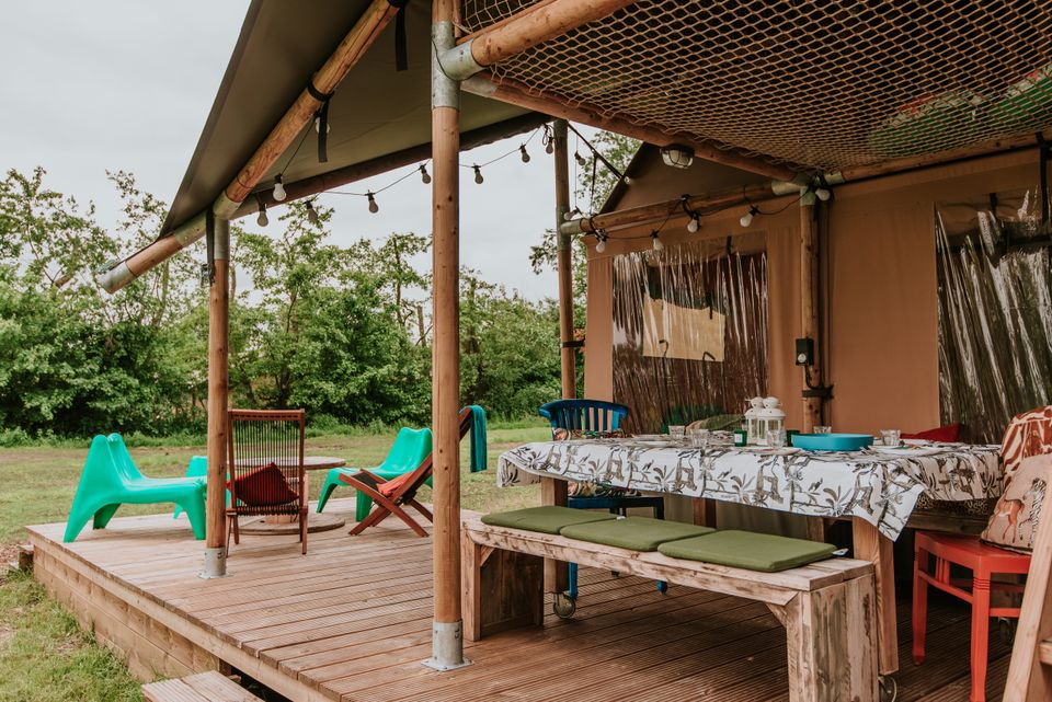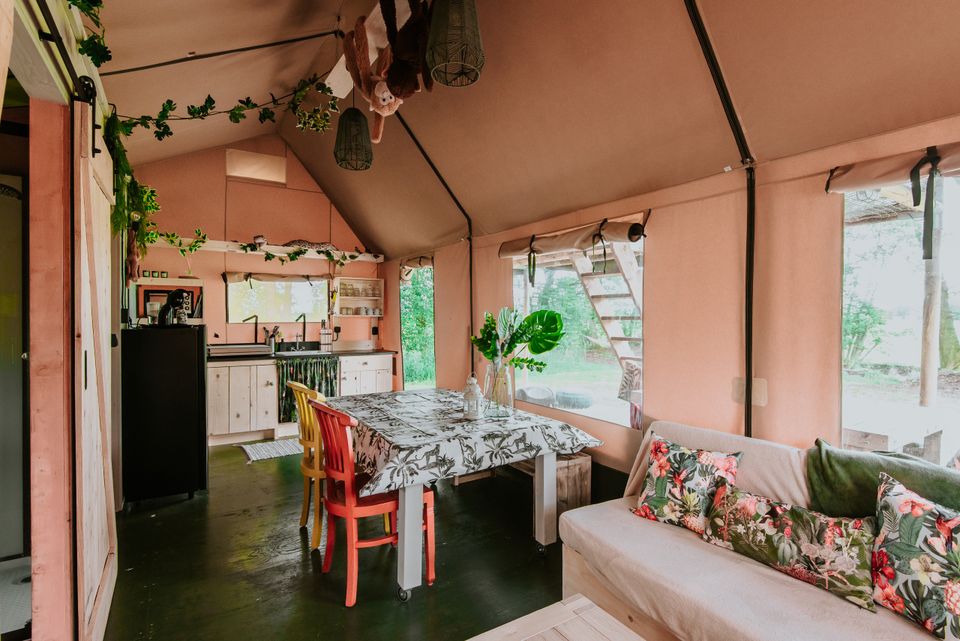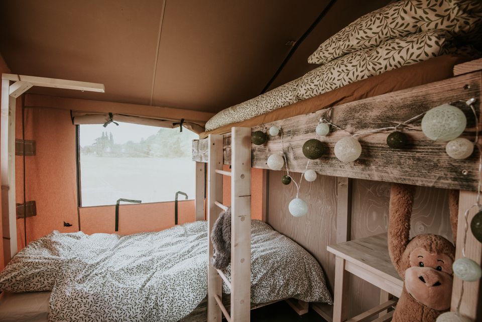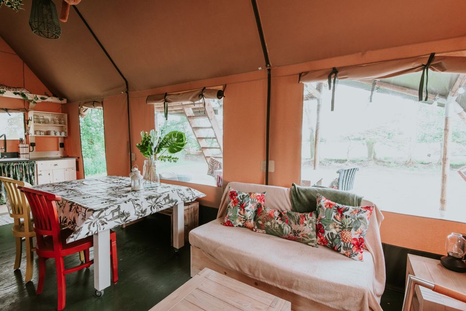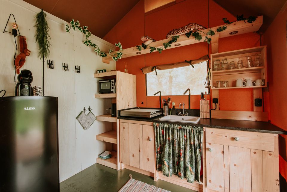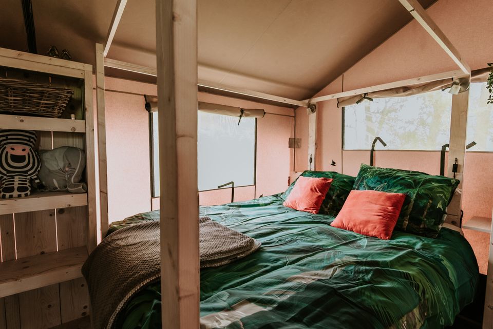 „De Jungle“ ist ein wunderschönes Familienzelt für sechs Personen (vier Erwachsene). Sie haben zwei Doppelbetten und zwei Einzelbetten. Eine Küche und ein Badezimmer sind im Zelt enthalten. Dieses ist mit allen Annehmlichkeiten ausgestattet. An einem kühlen Abend müssen Sie sich keine Sorgen machen, dass Ihnen kalt wird, denn ein warmer Gasheizer ist ebenfalls im Lieferumfang enthalten. Der Dschungel ist der perfekte Ort, wenn Sie auf der Suche nach einem coolen Aufenthalt für echte Abenteurer sind.