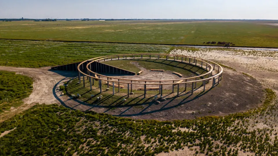 From the dike, you walk out onto the tidal flats towards a raised structure marked by a circle of columns that frame the view. The higher you climb, the further you see. Across salt marsh, sea and horizon. The landscape speaks for itself.