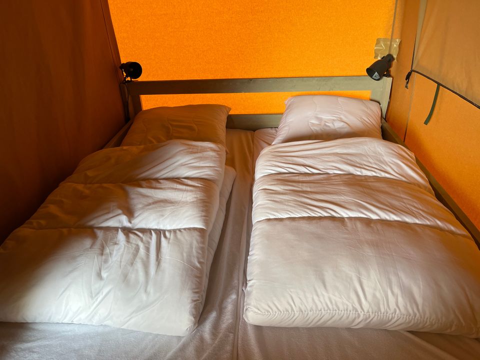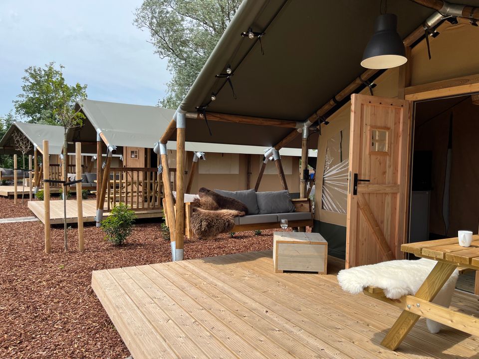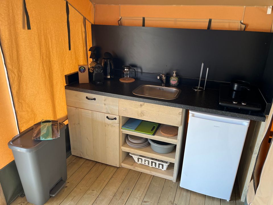 Enjoy a wonderful holiday in this spacious luxury four-person glamping tent. The tent has two separate sleeping areas! You will find two bedrooms, one with a double bed and one with a bunk bed. The tent also has a fully equipped kitchen with a refrigerator and induction hob. The kitchen is located in an open space where there is also a dining table with space for four people. On the large deck terrace there is a picnic table and a lovely bench with soft cushions to relax and enjoy the beautiful view.