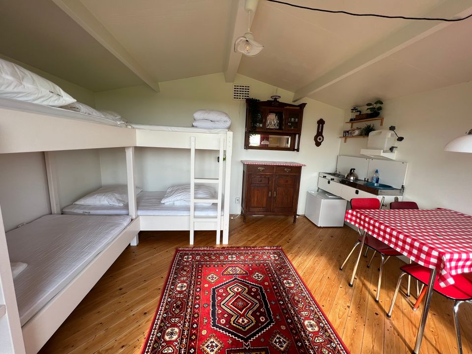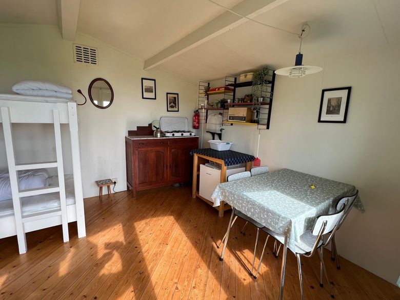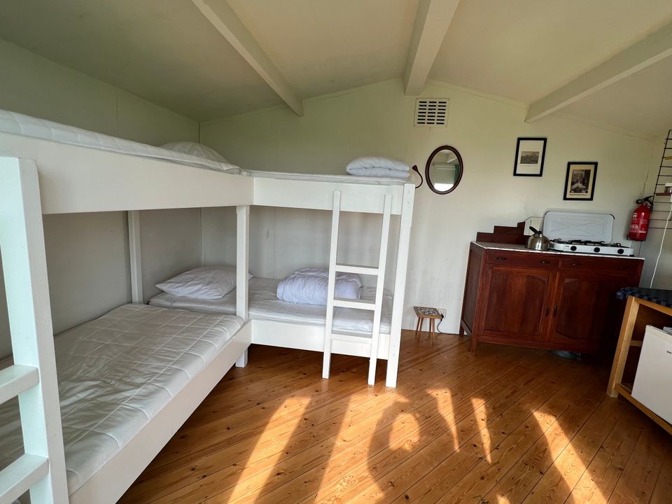 From the hiker's cabin you have a beautiful view over the countryside, you only have to look out the window or open the door and enjoy the peace and space. The hiker's cabin is compact, but fully equipped for four people. There are two bunk beds, each with a pillow and duvet, and a table with four chairs. Linen packages are available for rent. In addition, there is a complete kitchen that includes a gas stove and refrigerator. You do not have your own sanitary facilities in the hiker's cabin, but you can use the camping sanitary facilities which are within walking distance.