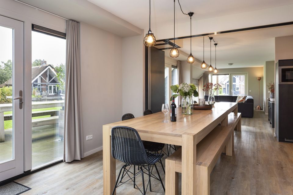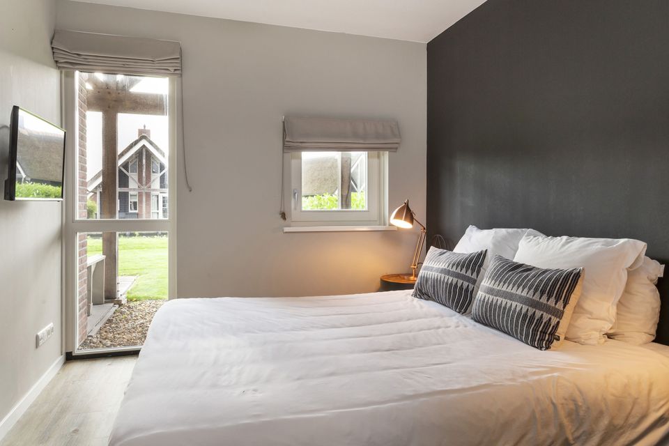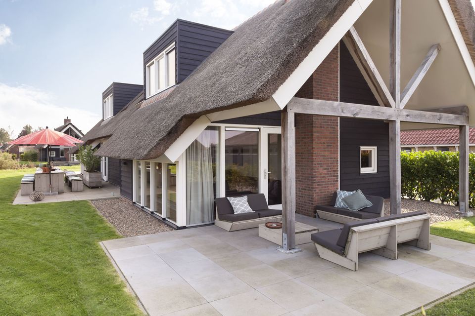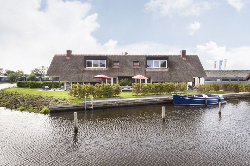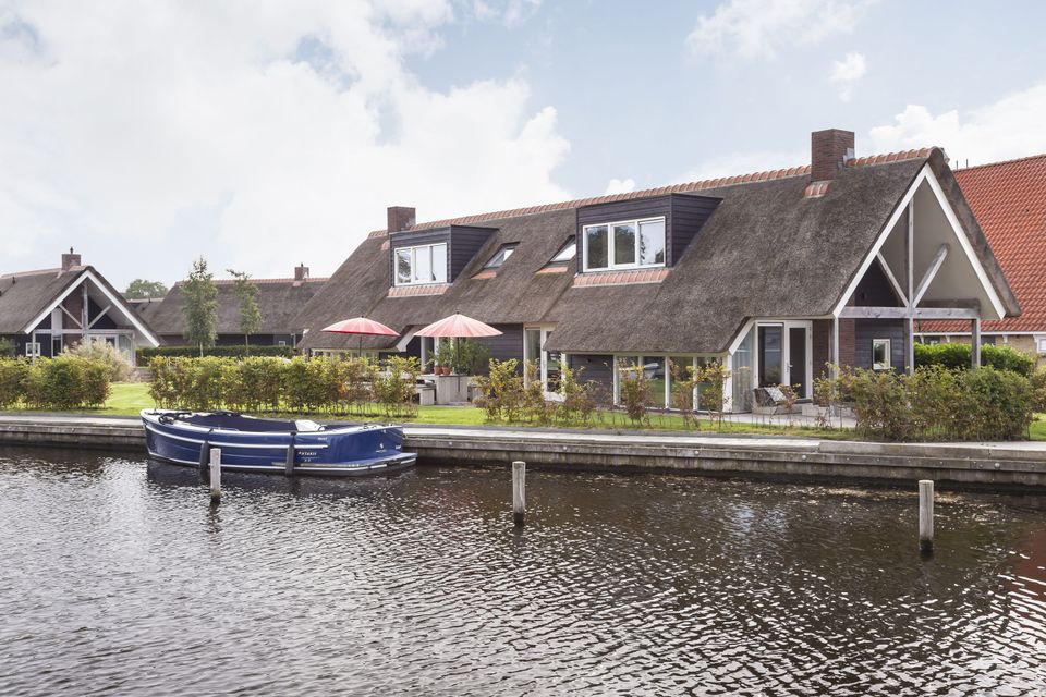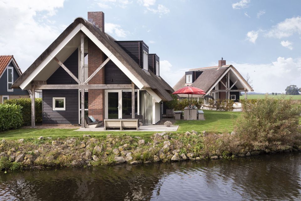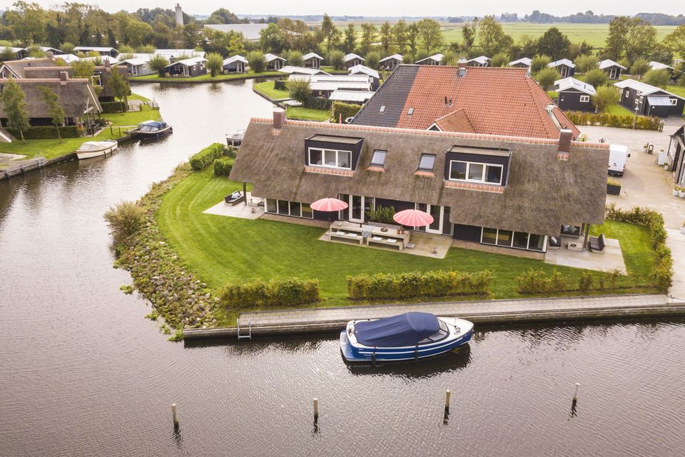 This beautiful thatched villa is suitable for 16 people. There is a spacious living room with two comfortable sitting areas and a long dining table where you can dine extensively. In addition, there are two kitchens. So you have 2 refrigerators, 2x a dishwasher and 2x an induction hob and oven! In total there are 8 bedrooms, two of which are on the ground floor. These two bedrooms have their own bathroom with shower, toilet and sink. The other bedrooms are on the first floor, as well as two bathrooms with shower, toilet and sink. In addition, there are also two extra toilets on the first floor, as well as two saunas! Around the house is a large garden with various seating areas. On both sides of the house there is a partially covered sitting area with comfortable sofas and on the long side of the house, with a beautiful view over the water, there are two long tables with benches, perfect for dining outside with your group when the weather is nice.