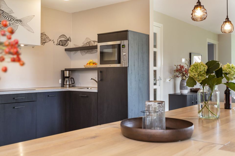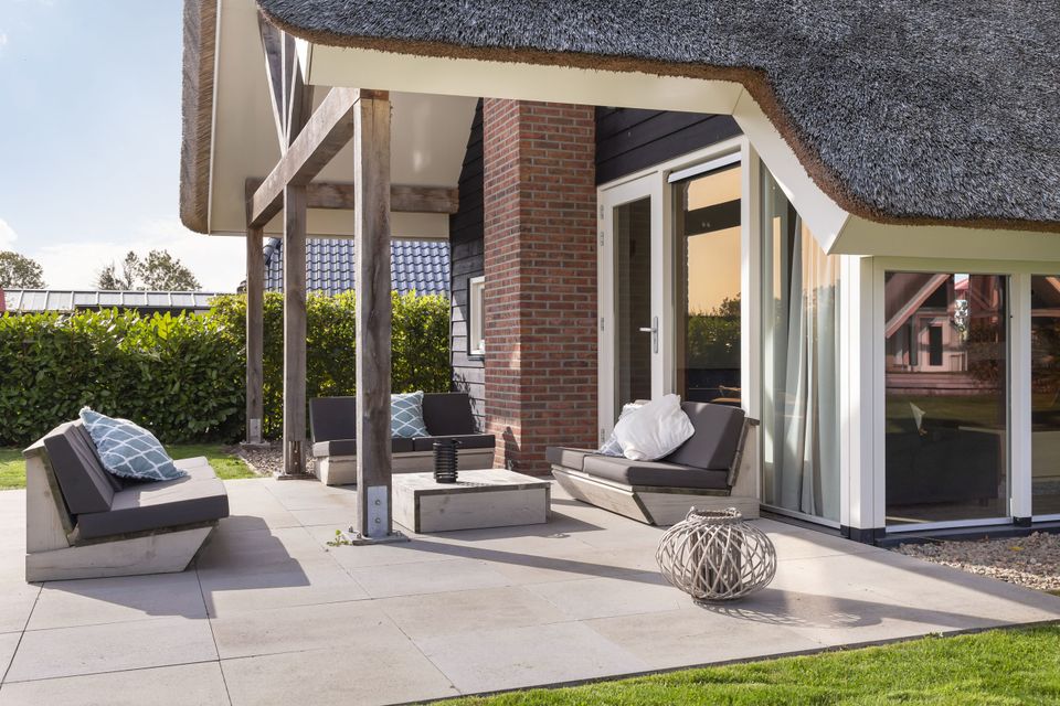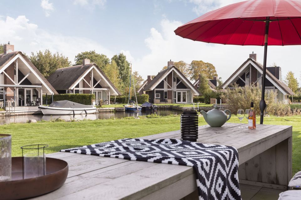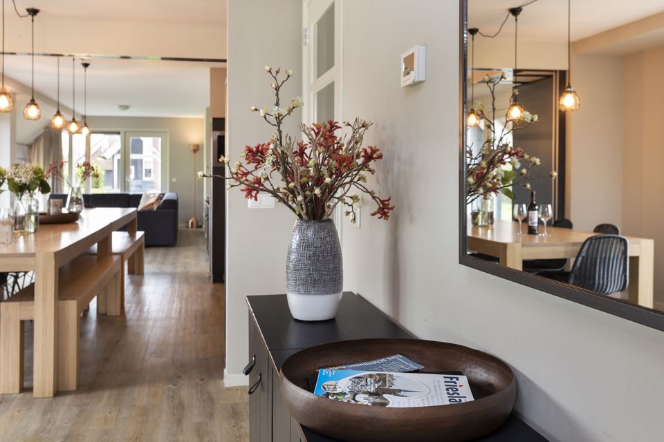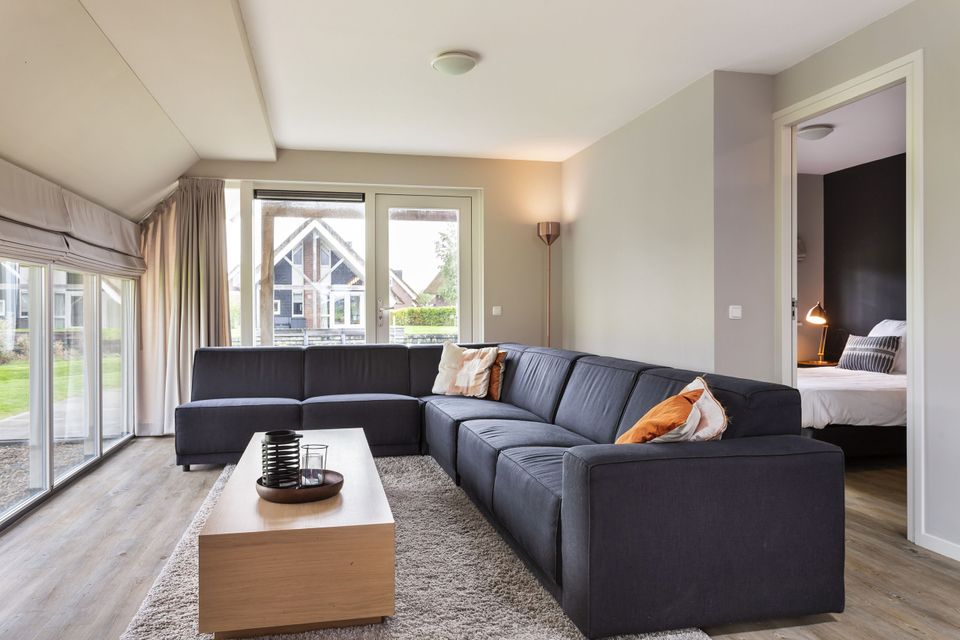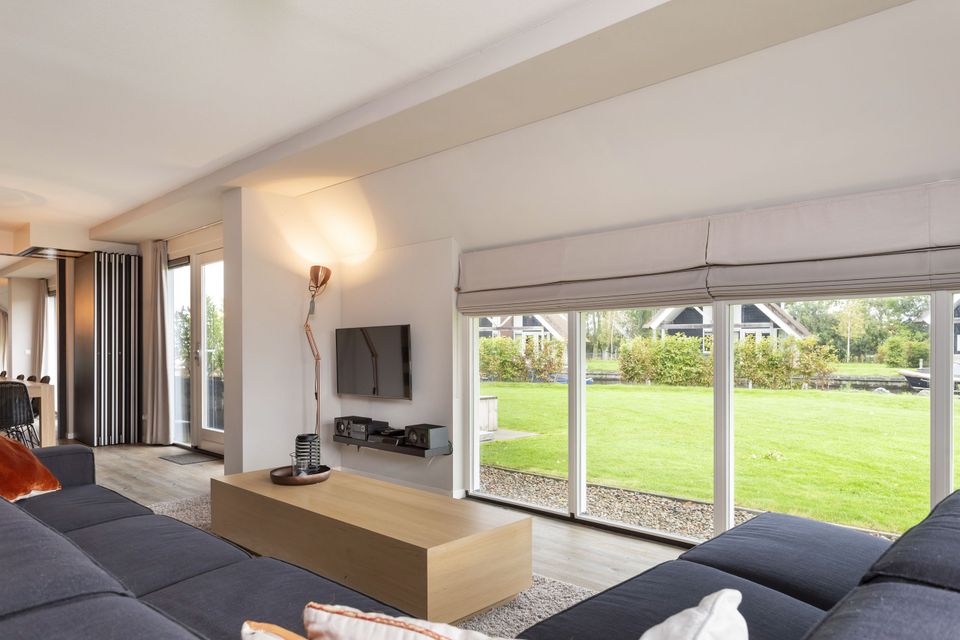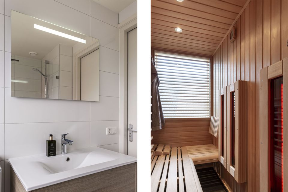 This beautiful thatched villa is suitable for 16 people. There is a spacious living room with two comfortable sitting areas and a long dining table where you can dine extensively. In addition, there are two kitchens. So you have 2 refrigerators, 2x a dishwasher and 2x an induction hob and oven! In total there are 8 bedrooms, two of which are on the ground floor. These two bedrooms have their own bathroom with shower, toilet and sink. The other bedrooms are on the first floor, as well as two bathrooms with shower, toilet and sink. In addition, there are also two extra toilets on the first floor, as well as two saunas! Around the house is a large garden with various seating areas. On both sides of the house there is a partially covered sitting area with comfortable sofas and on the long side of the house, with a beautiful view over the water, there are two long tables with benches, perfect for dining outside with your group when the weather is nice.