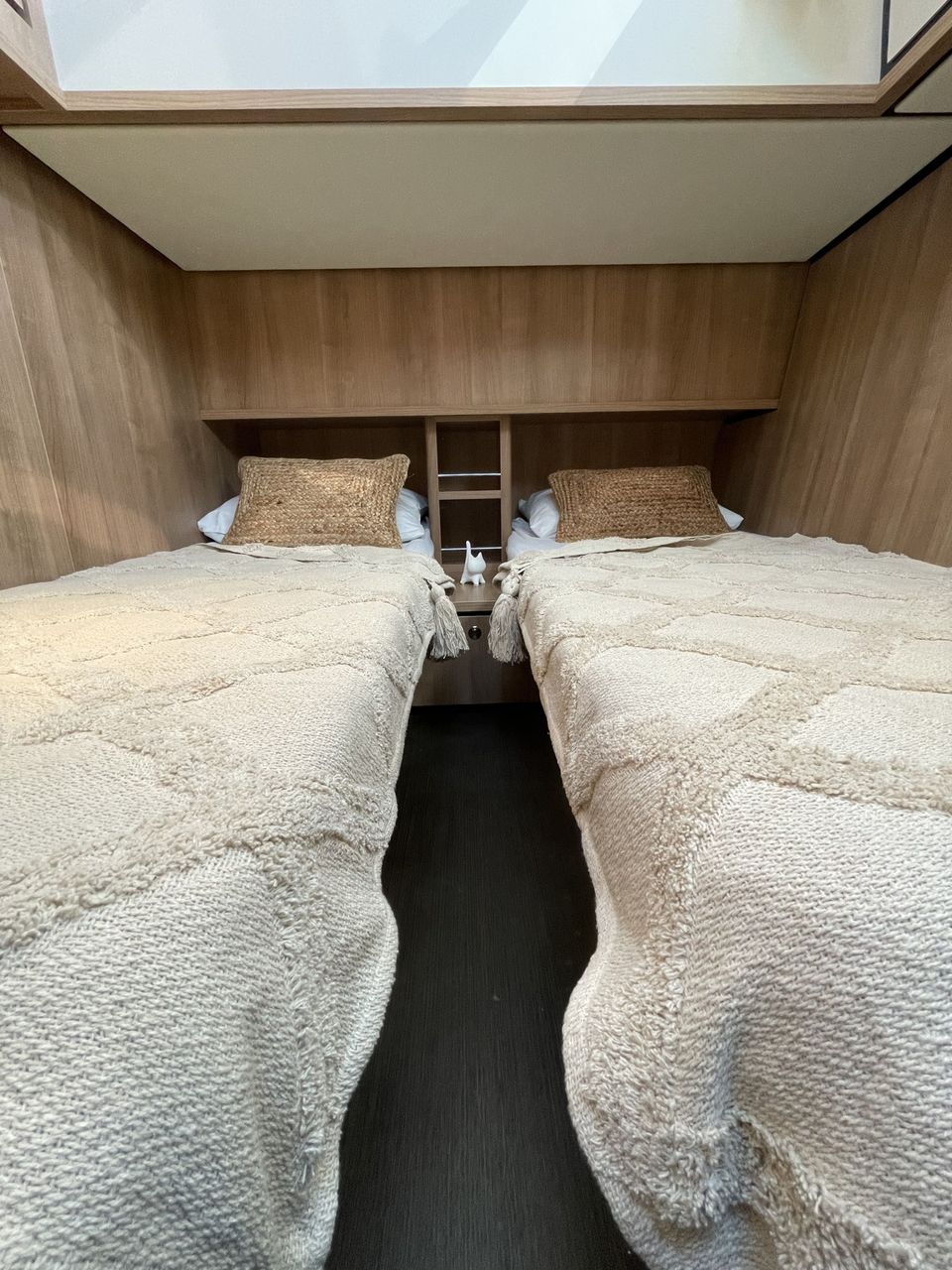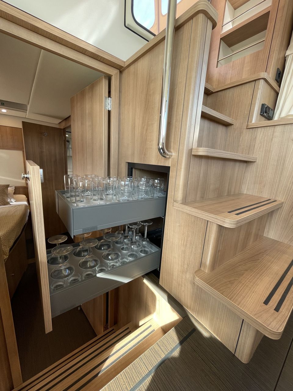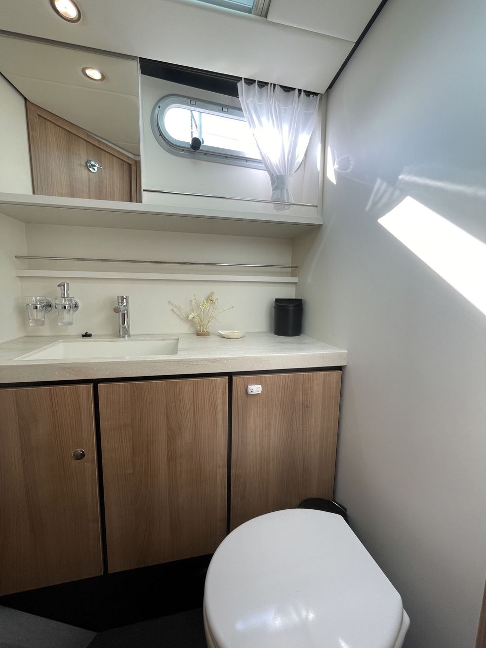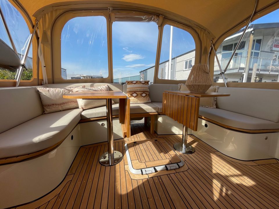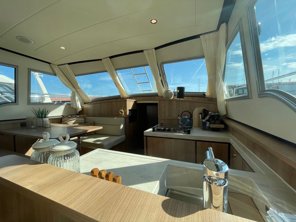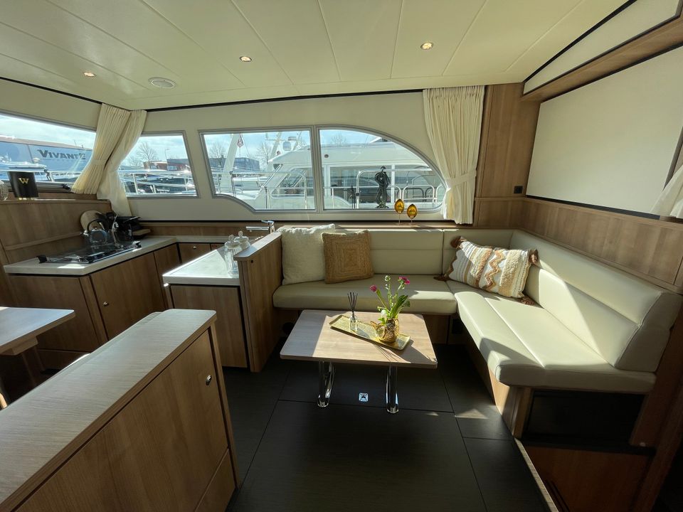 This luxury ship is equipped with beautiful details such as a teak aft deck! The boat has three sleeping cabins. Two sleeping cabins have a double bed with private bathroom and toilet. The third sleeping cabin has two single beds and sufficient cupboard space. The interior of this boat is light and a light type of wood has been used. Opposite the kitchen is a comfortable dining area with lots of light. The kitchen is spacious and includes a Nespresso machine. There is also a comfortable seating area with television and Apple TV. The aft deck has a spacious fixed sofa with cushions and is equipped with a convertible tent. On sunny days you can open it and when it rains you can easily close the tent. It is also possible to heat the aft deck! This yacht is fully equipped with a navigation package, bow and stern thruster.