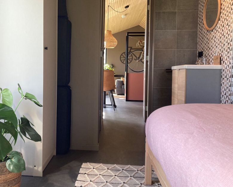 Tiny House Oblique is ideal for two people. It has a double bed, a bathroom with shower and a fully equipped kitchen, including dishwasher. The patio doors give access to a private garden with lounge sofa, a raised terrace and a fire pit with BBQ.