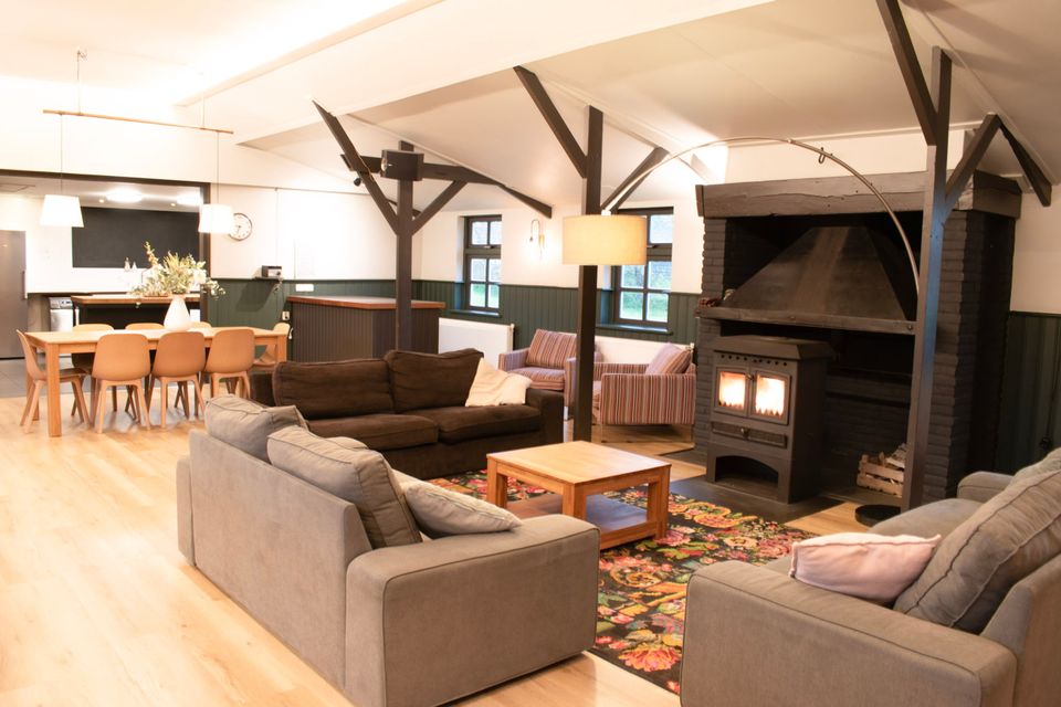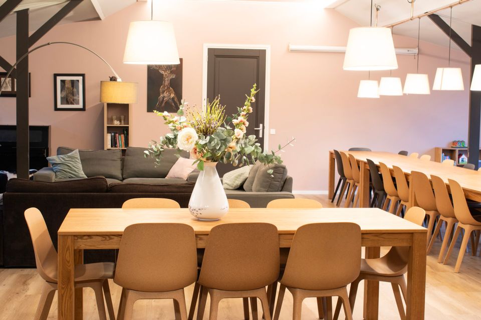 Comfortably furnished group accommodation with a spacious living room and outdoor pool