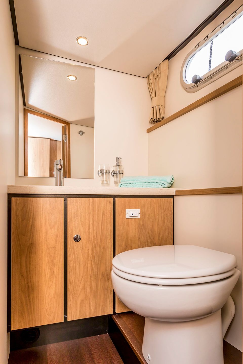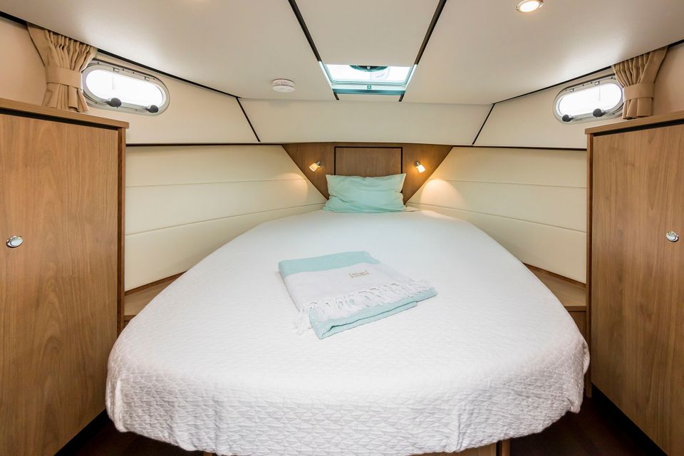 There are two sleeping quarters on board, the first of which is equipped with a spacious double bed (160x200) and the second bedroom has a slightly smaller double bed (140x200). Both bedrooms have en suite bathroom facilities, which consist of a toilet and sink. There is also a separate shower room. There is enough hot water through the boiler.
