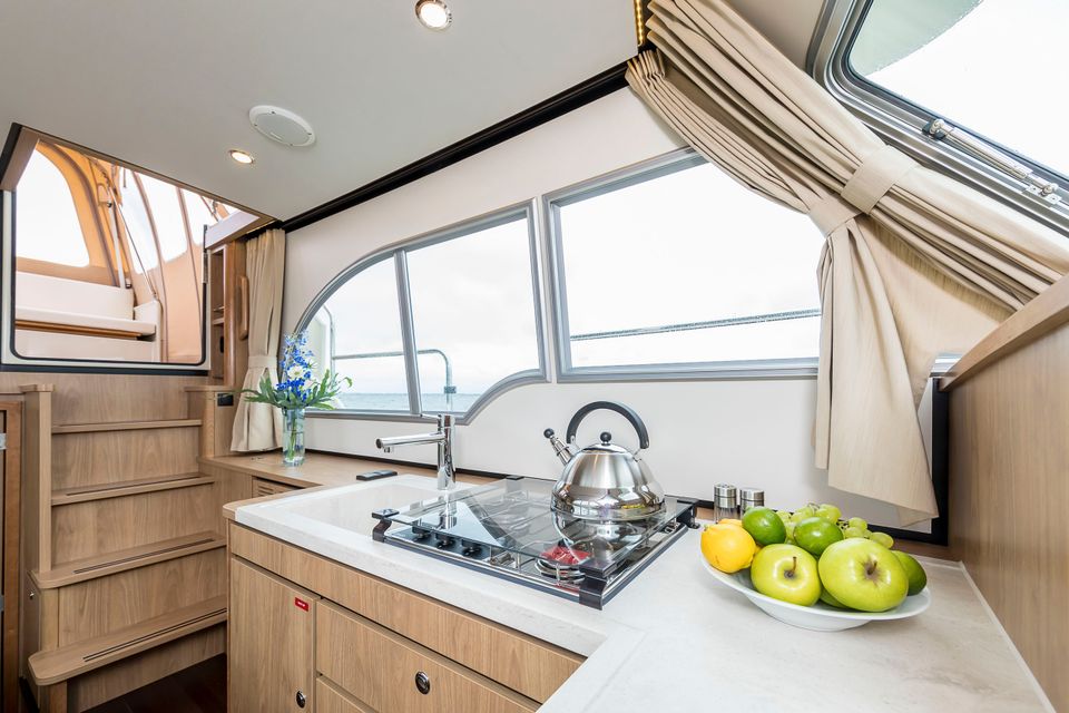 When you enter the motor yacht, you will notice the spacious headroom of almost 2 meters. There is a cozy sitting area with leather upholstery and a dining table, where you can prepare your route or watch television. The kitchen (or in ship's language, galley) is fully equipped with cooking utensils, coffee maker, kettle, etc. There is also a refrigerator with freezer compartment and a three-burner gas stove.