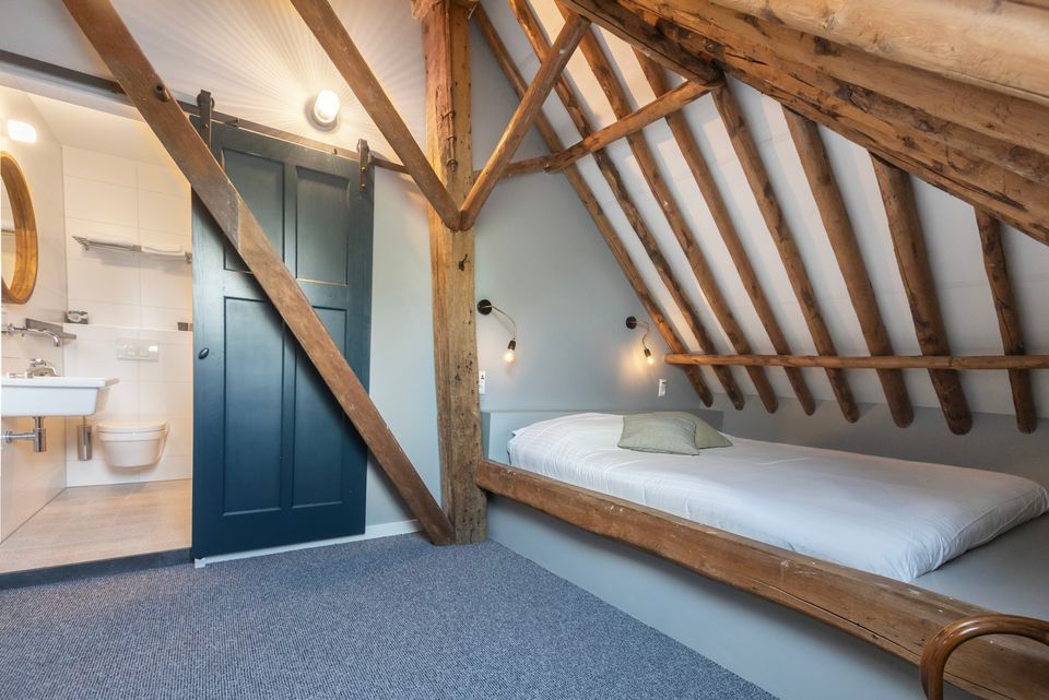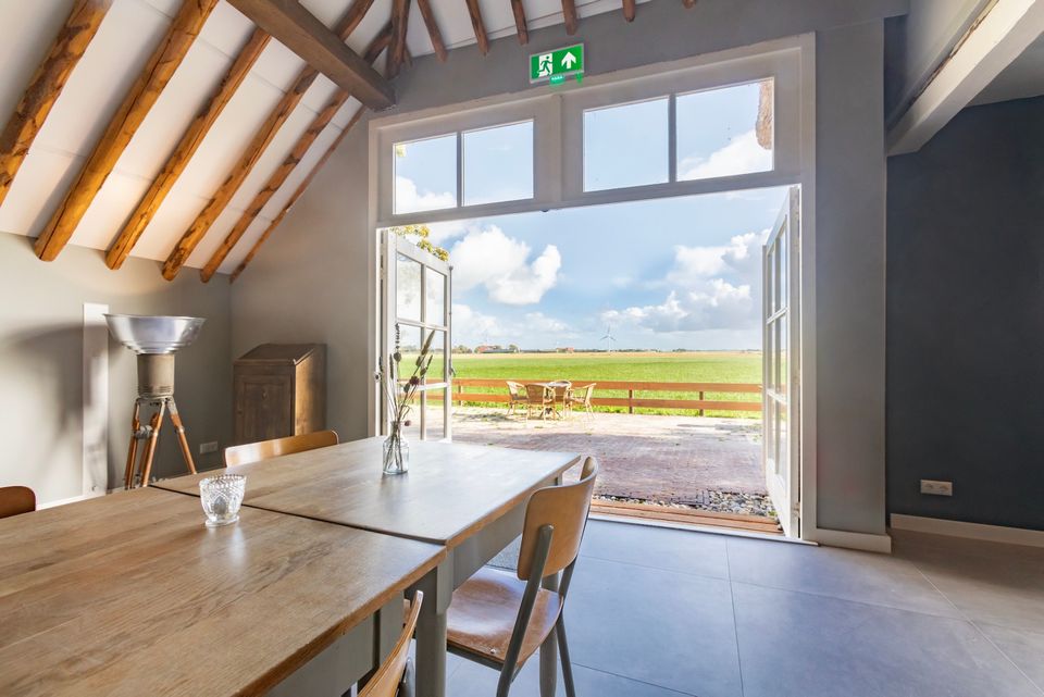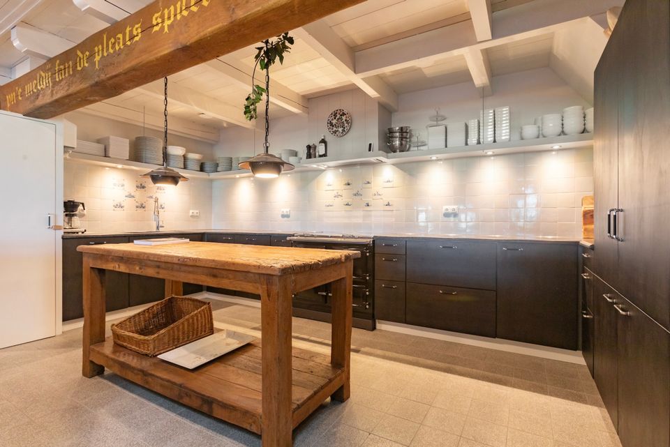 Nynke's Pleats offers spacious group accommodation for up to 20 people, with a beautiful large hall with bar on the ground floor and a spacious stable furnished as a living room with several seating areas. The many French doors provide access to the terraces around the farm, the flower meadow and the orchard, so you can optimally enjoy nature and the view. On the upper floor of the thatched barn there are 9 comfortable bedrooms, some with a private bathroom, some with luxurious shared sanitary facilities and a sauna.
