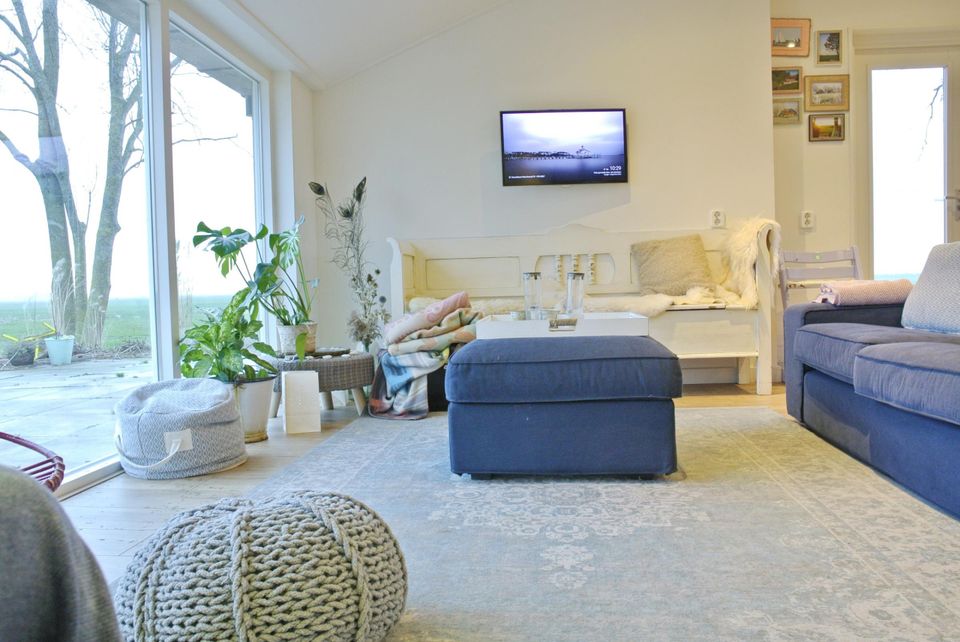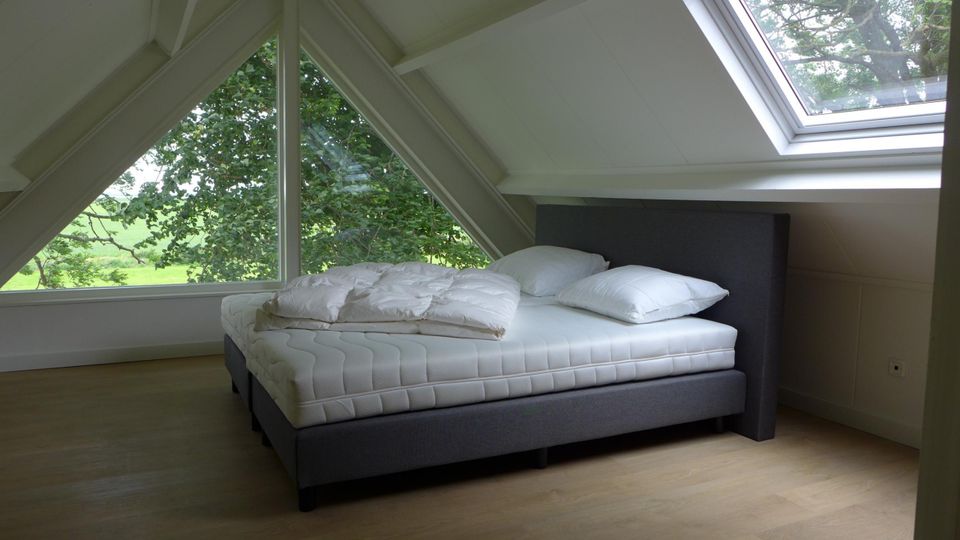 Holiday home de Druvebeam is located on the edge of Oudega and has an unobstructed view over the countryside and the water beyond. The house is located next to holiday farm Us Hiem with its harbour. The Druvebeam has large windows and patio doors, allowing light to enter from all sides. Everything is new and fully furnished with a complete open kitchen with a small bar and a spacious living room. On the ground floor are the bathroom with shower, toilet and sink, a children's room with bunk beds, a bedroom with a spacious double bed, a separate toilet and a utility room with washing machine and dryer. There is enough space to store your sailing gear. On the first floor there is a bedroom with a spacious double bed and a bedroom with four single beds. Spacious enough for all children. Do you still miss some privacy? It is possible to set up your own tent. The Druvebeam is ideal for couples, small groups of friends and families (with children). There is a large playing field to the side of the house with a trampoline and barbecue.