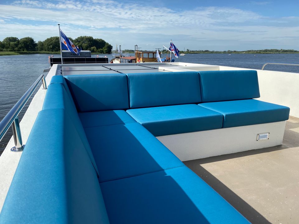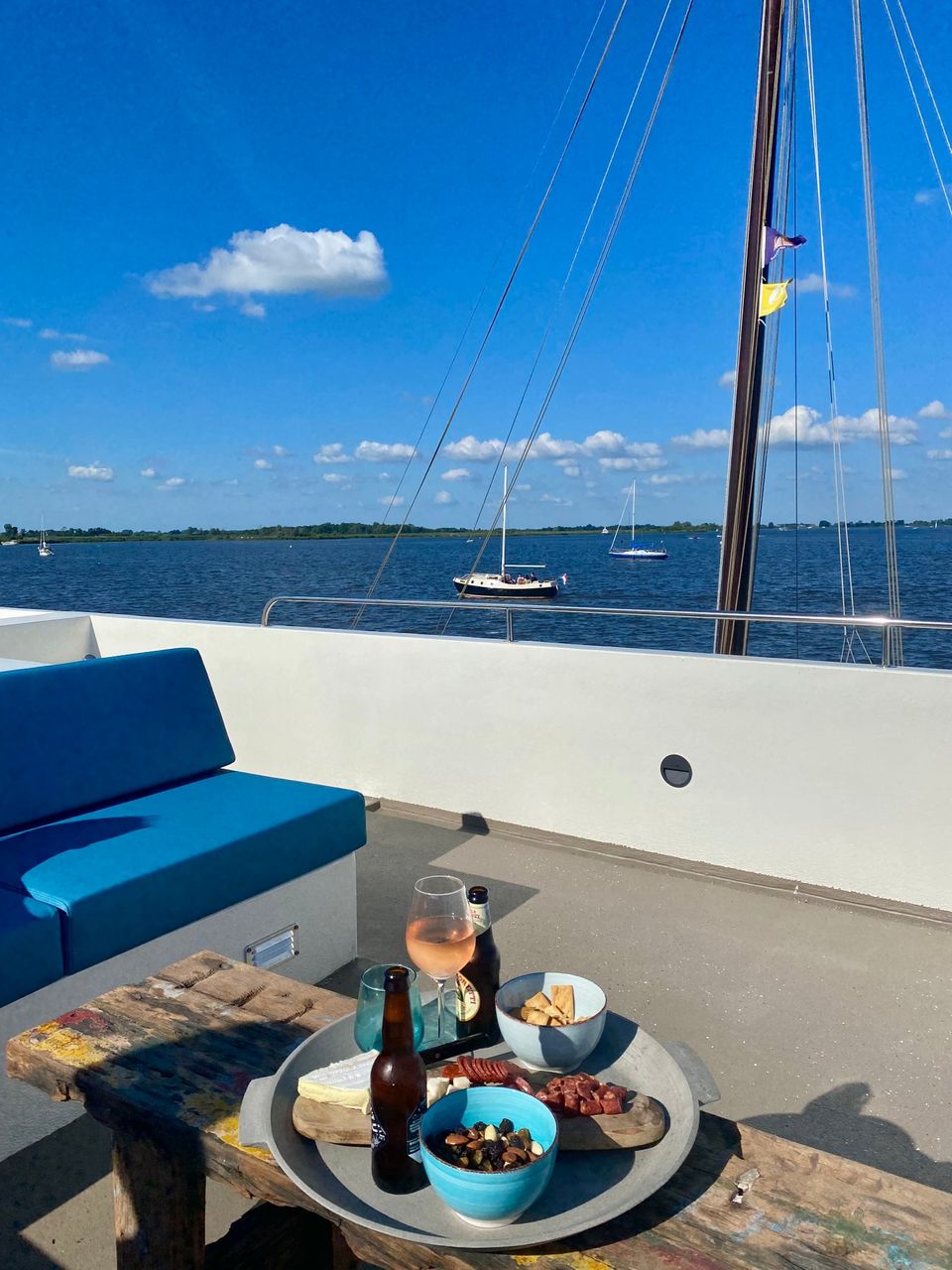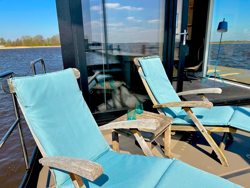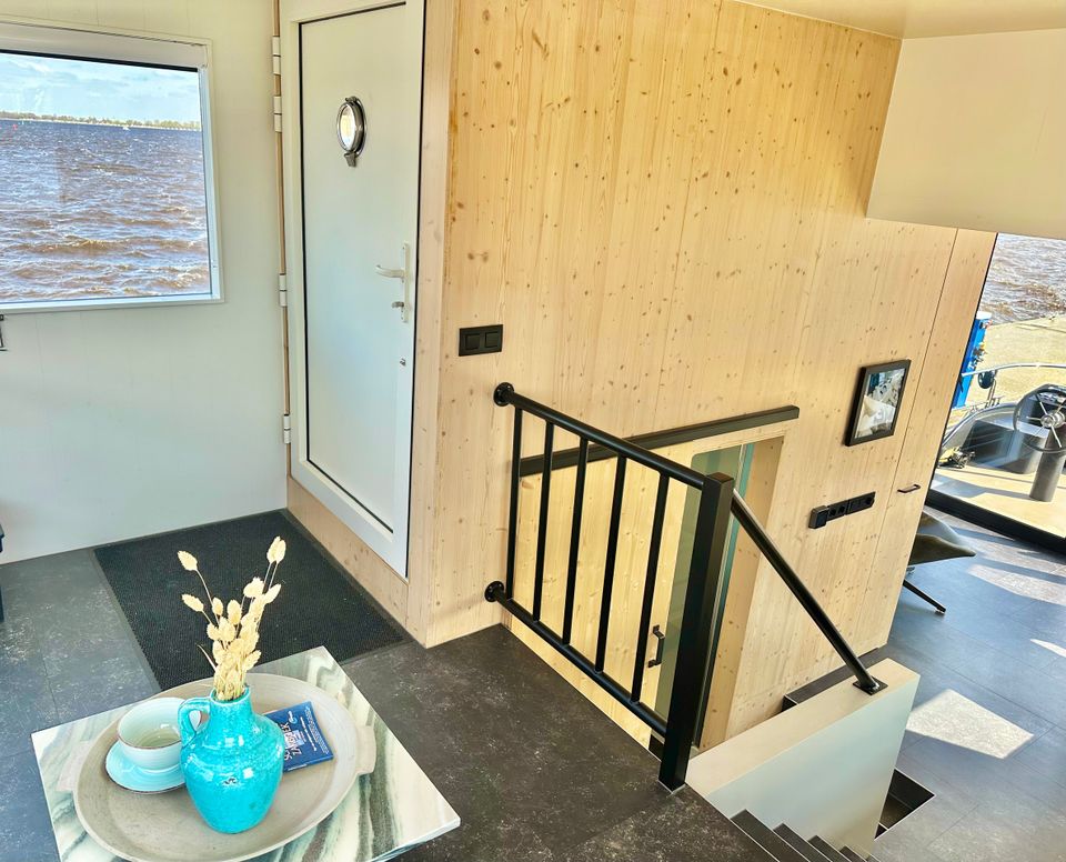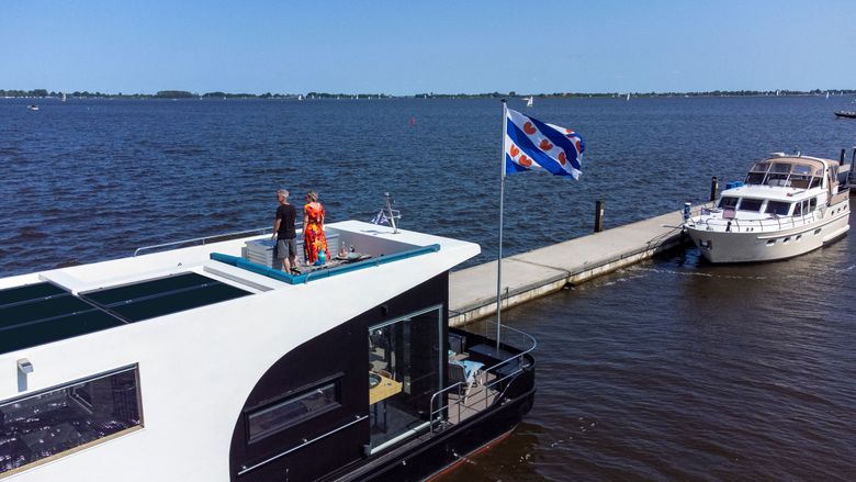 This fine VaarLoft is rented out stationary at a top location! It is a 15 meter long, industrially furnished boat, wonderfully comfortable and offers a beautiful view over the Sneekermeer. You enter the VaarLoft in the hold, where there is a nice double Auping box-spring bed. Also in the hold is the bathroom with shower, toilet and sink. By walking up a few steps you come to the fully equipped kitchen with cozy dining area at the bar. In the cozy living room there is a cozy sitting area with a couch that can be extended into a double sofa bed. Via the living room you step via the stairs to the spacious roof terrace, here are comfortable couches and you can enjoy a spectacular view over the Sneekermeer! On the deck there is another terrace with two comfortable (lounge) chairs. (There is no Wi-Fi on board)