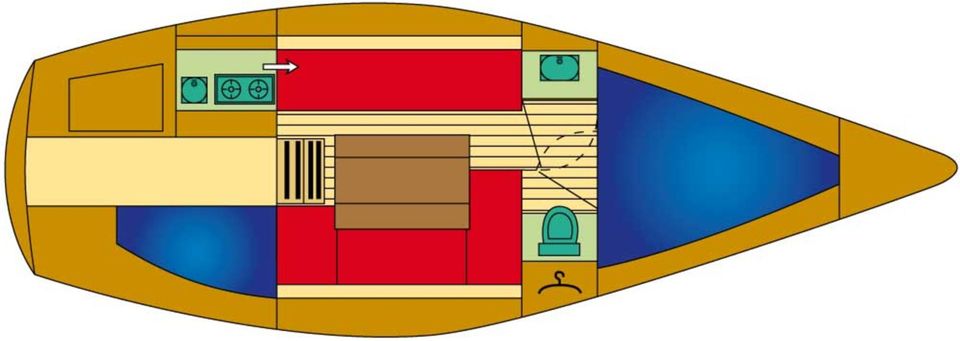 This sailing yacht has a GPS, VHF radio and strong diesel engine. Inside there is a cozy sitting area with a separate toilet. There are two sleeping cabins, one with a double bed and the other with a bunk bed. The sofa can be turned into a sleeping place for a fifth person.