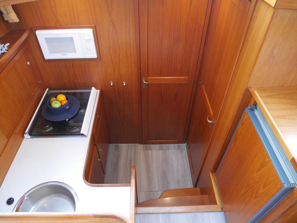 Layout: The saloon has a spacious sitting area and cupboard wall, and is in open connection with the well-equipped galley. Here you will find a 4-burner gas stove, refrigerator, microwave, coffee maker, kettle and a complete inventory for 4 people.