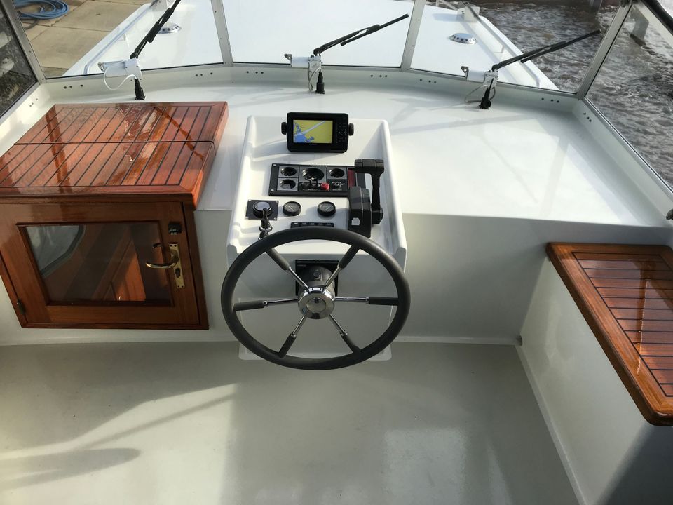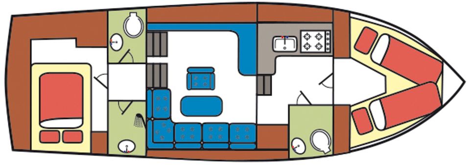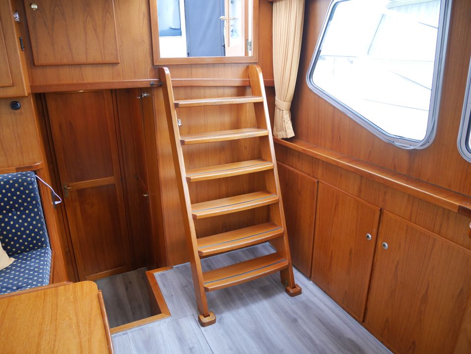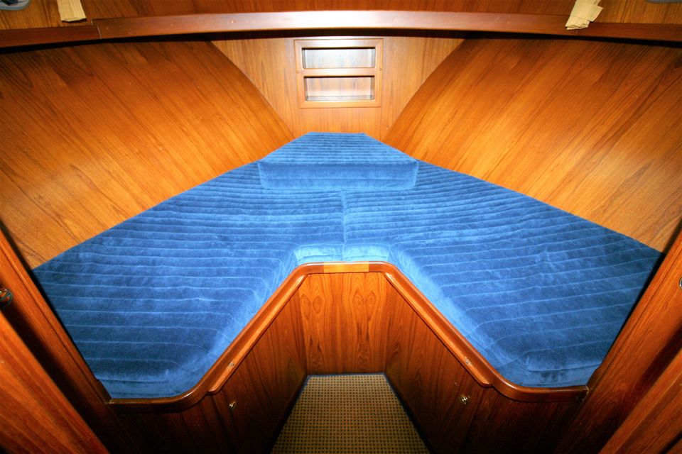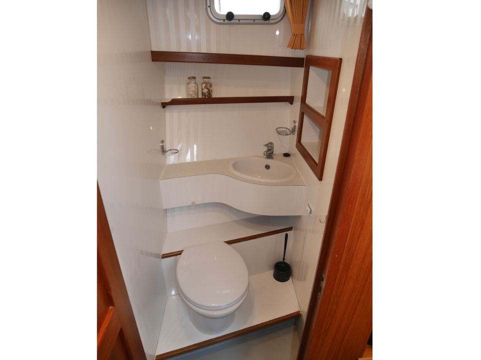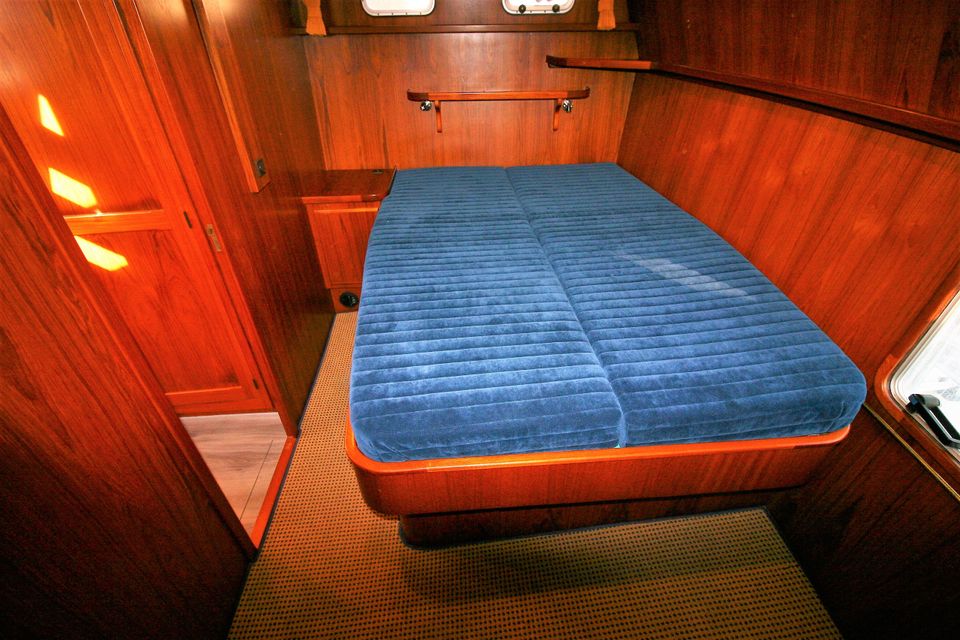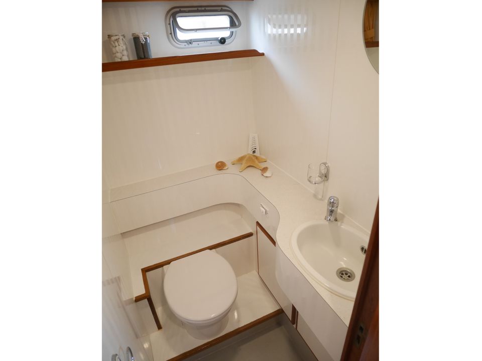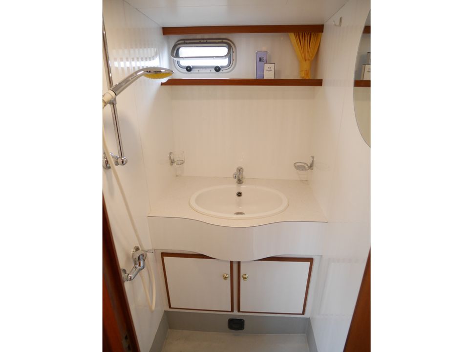 In the foreship there is a closed cabin with a V-bed with slatted base. With an intermediate piece you can easily make it a double bed. There is also an electric toilet with washbasin. The aft cabin has a semi-detached double bed with slatted base, a second toilet room with electric toilet and washbasin, and a separate shower.