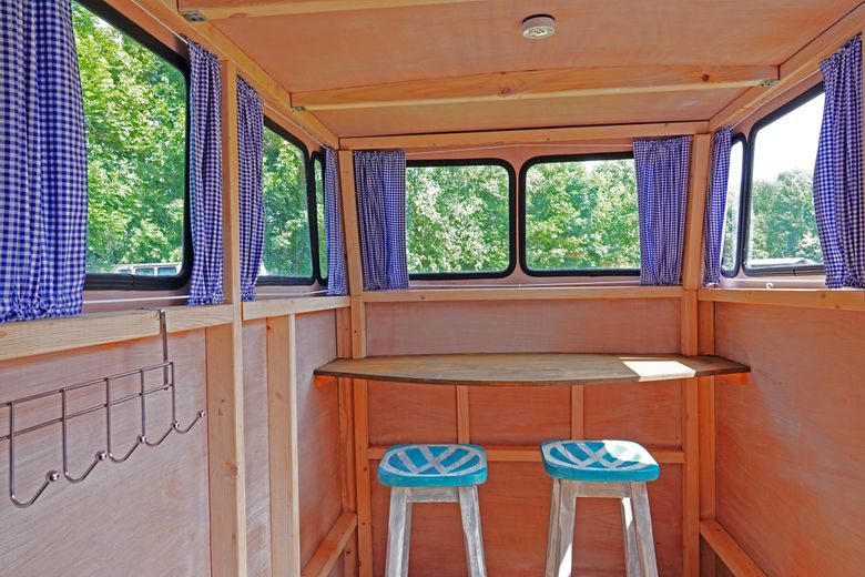 If you are looking for a unique holiday accommodation, this VW bus is definitely for you. The double cabin transports you directly back to the 60s feeling! The many windows let the light into the cabin and you can really enjoy the surroundings. Outside on the terrace, a table and two chairs welcome you. Inside, the cabin is simply furnished; there is a double bed which can be folded into a nice sofa and there is also a table with two stools inside. A unique sleeping experience that gives you that hippie feeling again. Freedom happiness! Breakfast is served in the B&B.