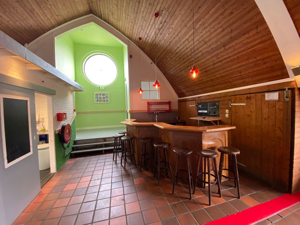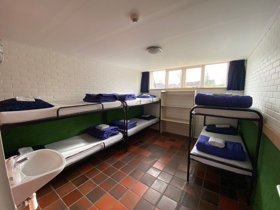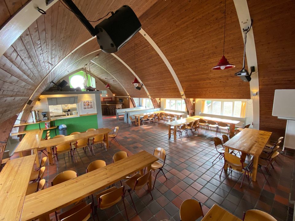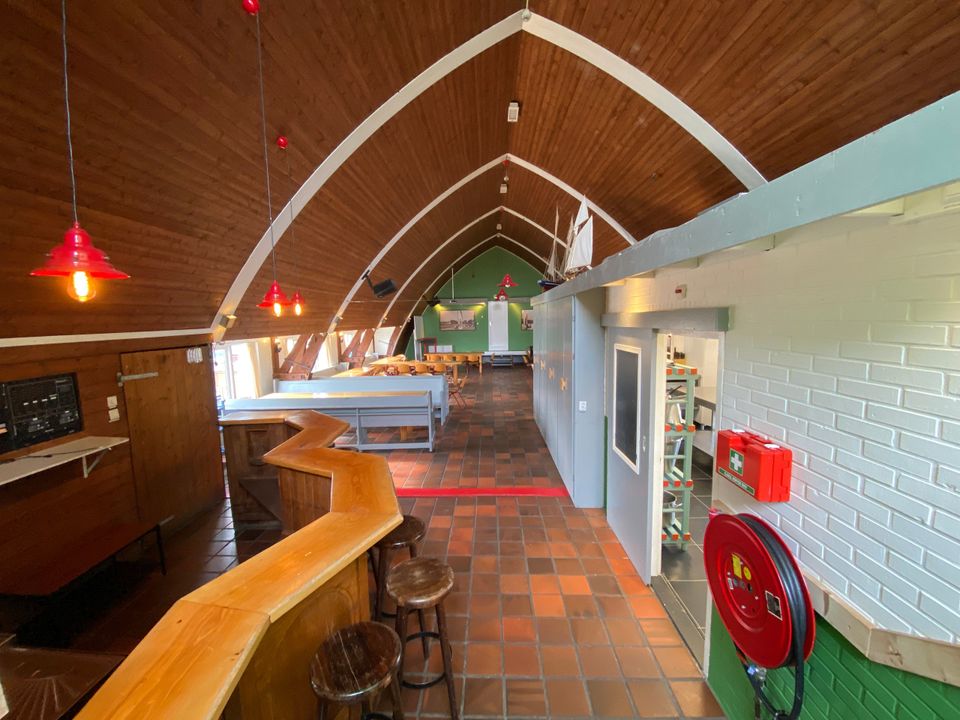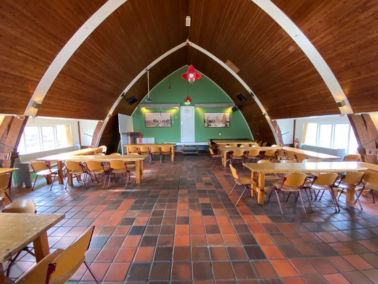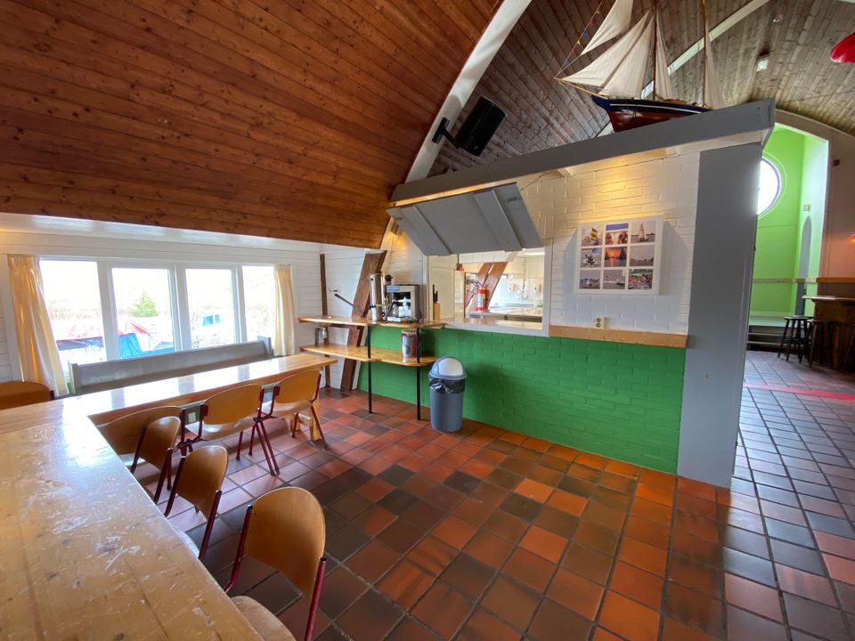 This unique group accommodation has been realized in a former church. The entire ground floor has been designed in such a way that there are 11 bedrooms, enough for a maximum of 68 people. There are 12 showers and 6 toilets in the accommodation, these are also located on the ground floor. On the first floor, in the ridge of the church, a large living space has been realized, including a spacious, fully equipped kitchen. There is also a bar and several tables with chairs. Around the accommodation is a terrace and playing field. Because of its location on the water, you can get on your boat in no time to explore the area from the water!