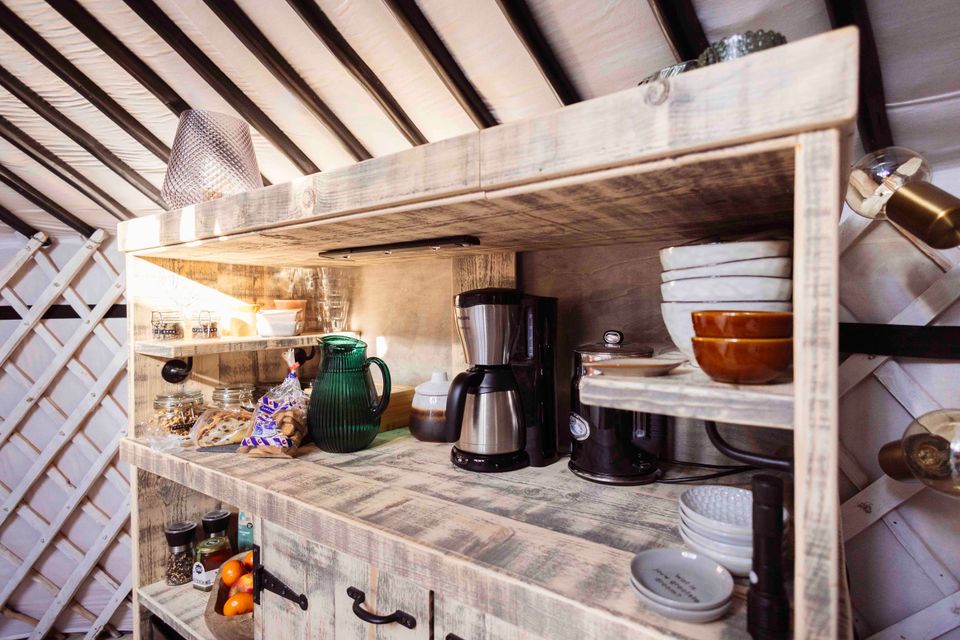 This spacious yurt is equipped with every convenience. With a unique design, wood stove and a cozy coffee/tea corner, you are assured of an excellent stay. There is room for two adults and possibly two children. The sanitary facilities are nearby, equipped with a shower cabin, toilet and sink. Shampoo, shower gel and conditioner are also provided. A hot tub is available near the yurt and can be booked as an option.