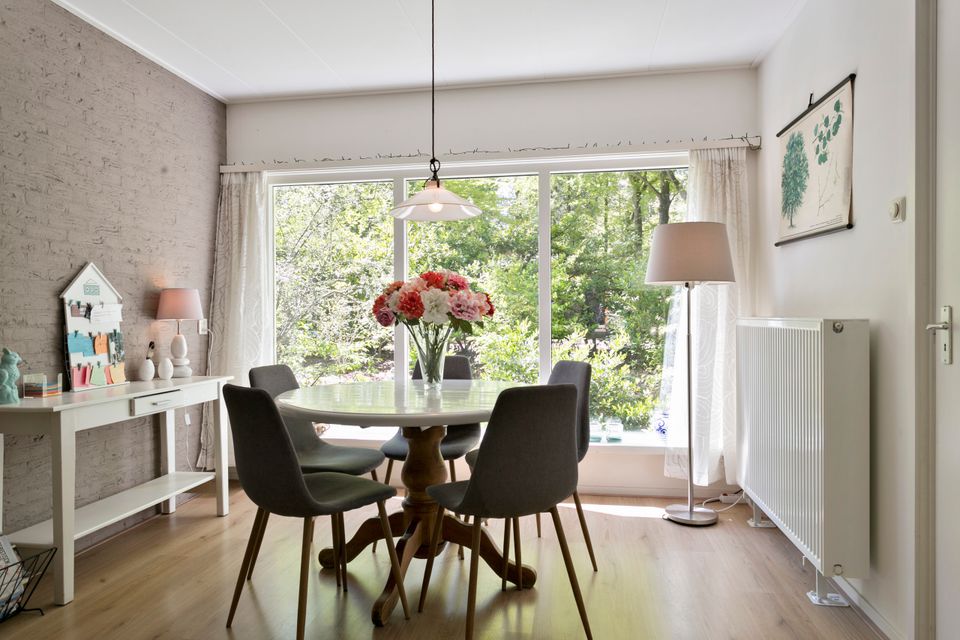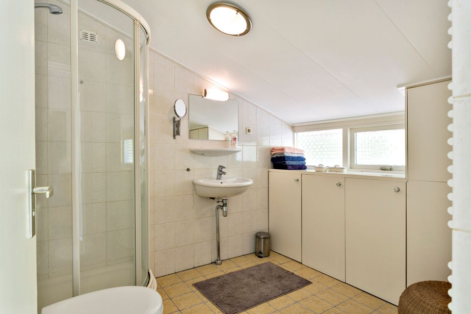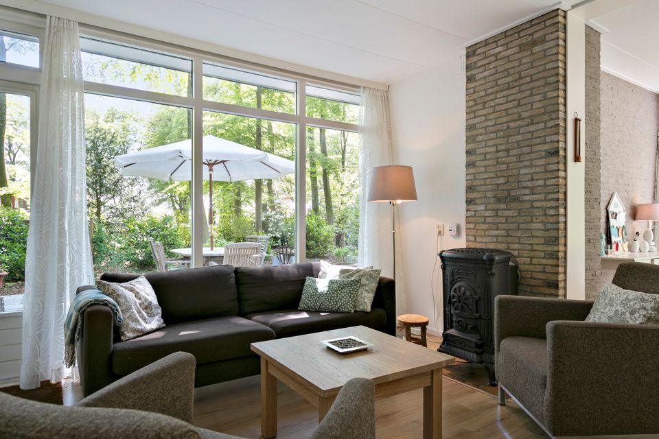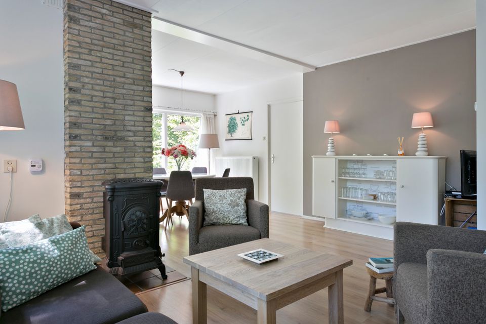 Boshuis 't Zusje has a light and spacious living room with a comfortable sitting area, a gas heater, a separate dining area and a television. The kitchen is equipped with a gas stove, oven, refrigerator, dishwasher and all other necessary kitchen utensils. There are two bedrooms on the ground floor: one with 1 single bed and a double bed and one with a double bed. In addition, there is a storage room with a washing machine and a driveway with space for two cars. There is a spacious terrace behind the house, a barbecue, a fireplace and a shady seating area next to the house.