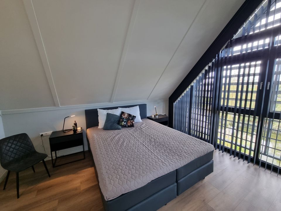 This villa is everything you are looking for when you want to spend your holiday in the Frisian lake area with your family. The villa is located on open waters, and you can sail onto the Slotermeer in no time! On the ground floor of this villa there is a spacious living room and nice kitchen. You will also find a bedroom with private bathroom on this floor. The interior of the house is industrial but cozy. From the living room you can step onto the terrace on the water, where you can also moor the boat. There are three bedrooms on the first floor. There is a children's bedroom with a bunk bed and two bedrooms with box-spring beds. There are two bathrooms on the first floor, as well as a separate toilet. - Good to know, the garden is fenced.