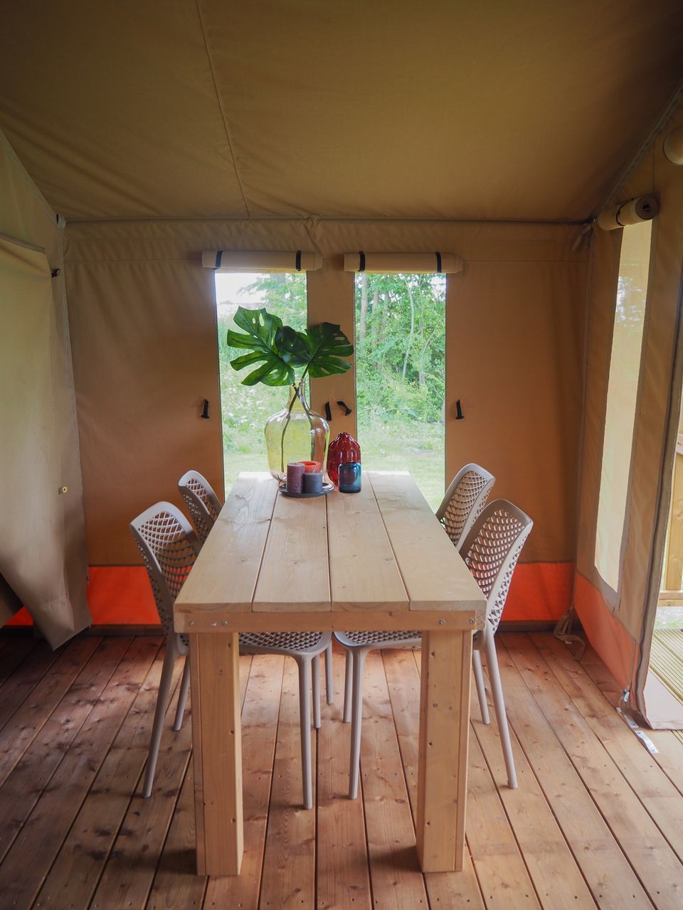 The campsite has two sturdy and robust safari tents that can accommodate five people. The tents are modern and luxuriously furnished. The front of the safari tent can be fully opened, which creates a wonderfully open feeling in good weather. In addition, each tent has a terrace with an awning, so that you can sit outside comfortably even in bad weather. Inside you will find a spacious and cozy front cabin where you can relax. The kitchen is fully equipped and has running water. In the kitchen cupboard there are pans and crockery ready to serve all the delicious food you prepare on the electric hob. The kitchen is also equipped with a refrigerator, a coffee maker and a kettle. The tent has two sleeping cabins. Both cabins have a double bed (140 × 200 cm), and in one of the rooms there is also a bunk bed. Bed linen is included, so that you can enjoy a good night's sleep without any worries. Although the safari tents do not have their own sanitary facilities, you can use our spacious, modern sanitary building on the campsite, where you can shower for free.