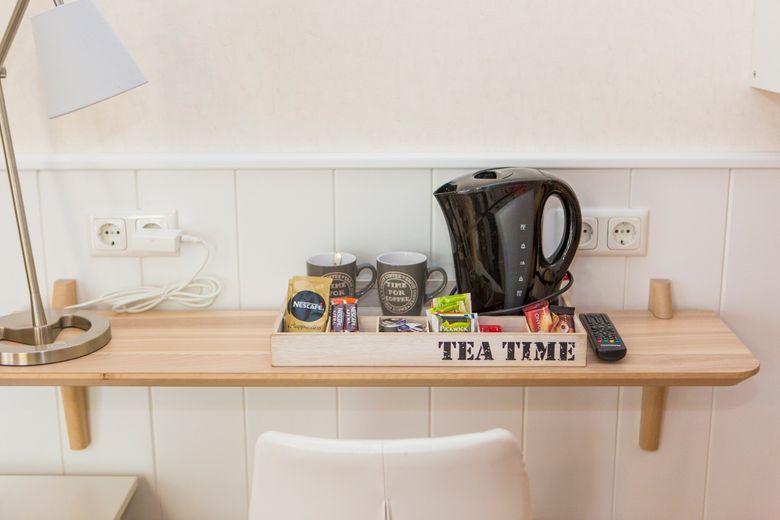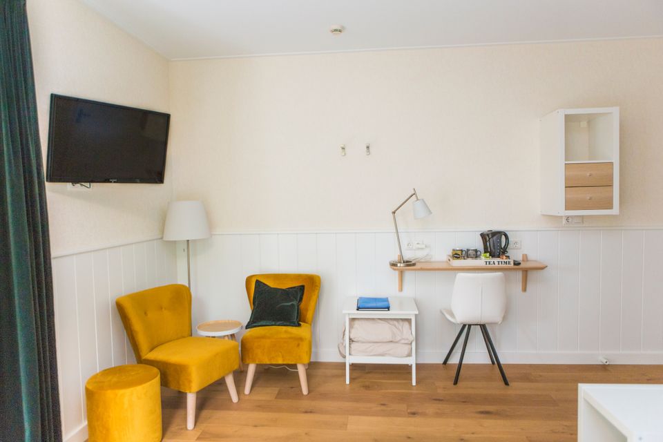 The rooms are spacious and equipped with two separate box spring beds and an extra seat. Each room has a television, bathroom with toilet, sink and walk-in shower. There are facilities to make a cup of tea or coffee in your room.