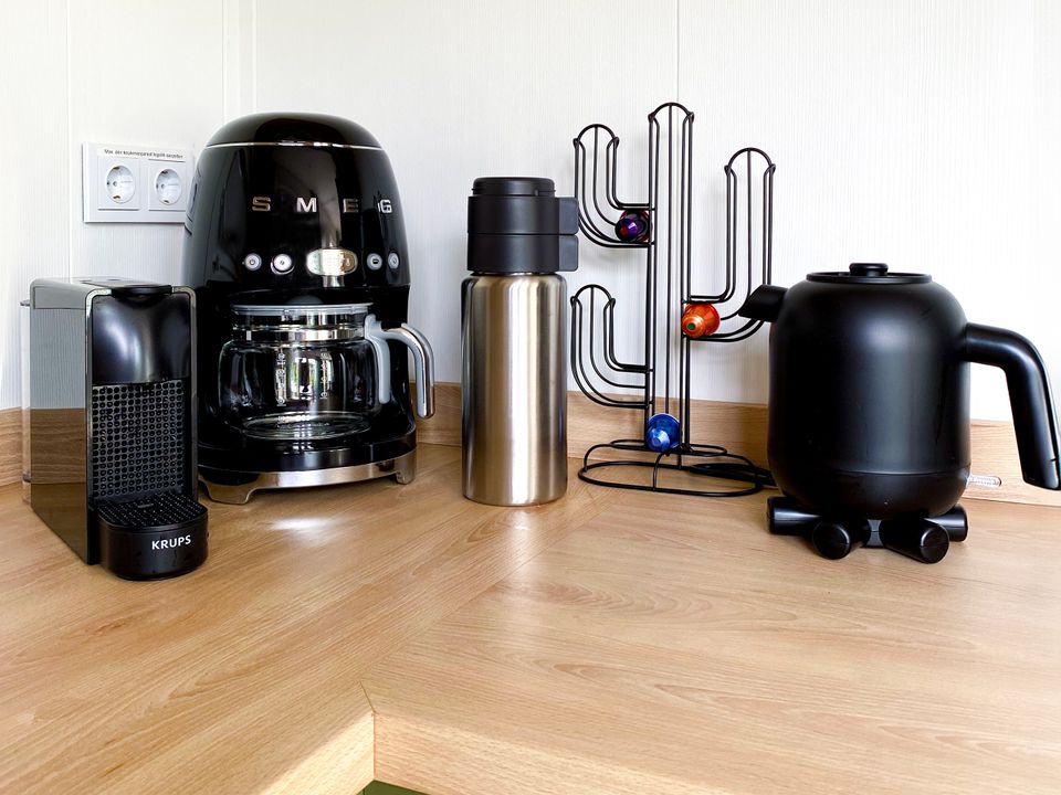 The kitchen is fully equipped and includes a dishwasher, combination microwave, refrigerator with freezer, Smeg coffee maker, Nespresso machine, and kettle.