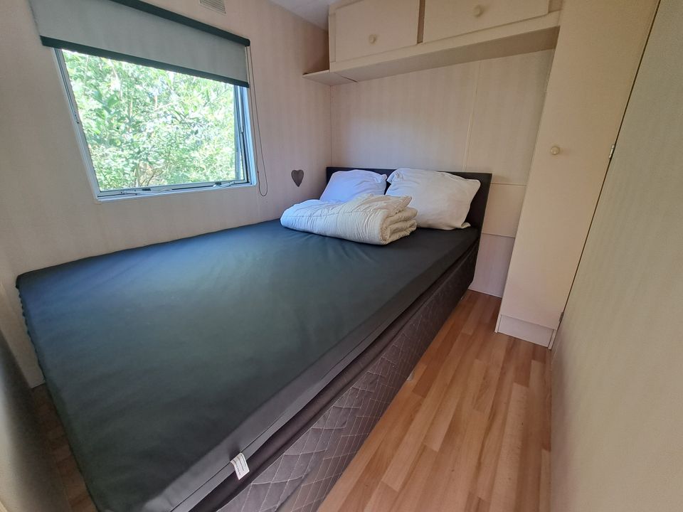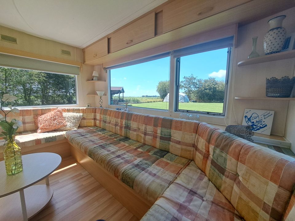 This nice mobile home is suitable for four people. There are two bedrooms, one with a double bed and one with two single beds. The beds have pillows and a duvet, you must bring your own bedding. There is also a bathroom with shower, toilet and sink. The living and dining room of this mobile home is spacious with long sofas and a separate dining area. The kitchen is compact but complete, including a gas hob, refrigerator and filter coffee maker.