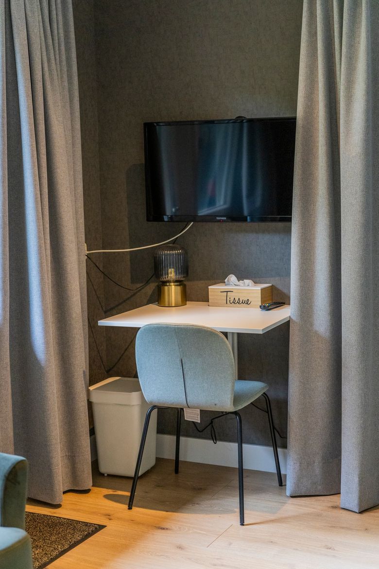 Hotel Restaurant Jans offers 15 rooms in Swedish chalets located in the garden behind the hotel. Each room has a private entrance and a small terrace. The chalets feature a spacious bedroom with two single beds, a bathroom, and a seating area.