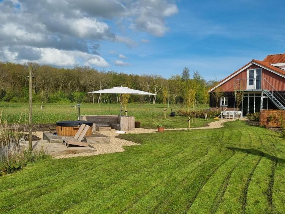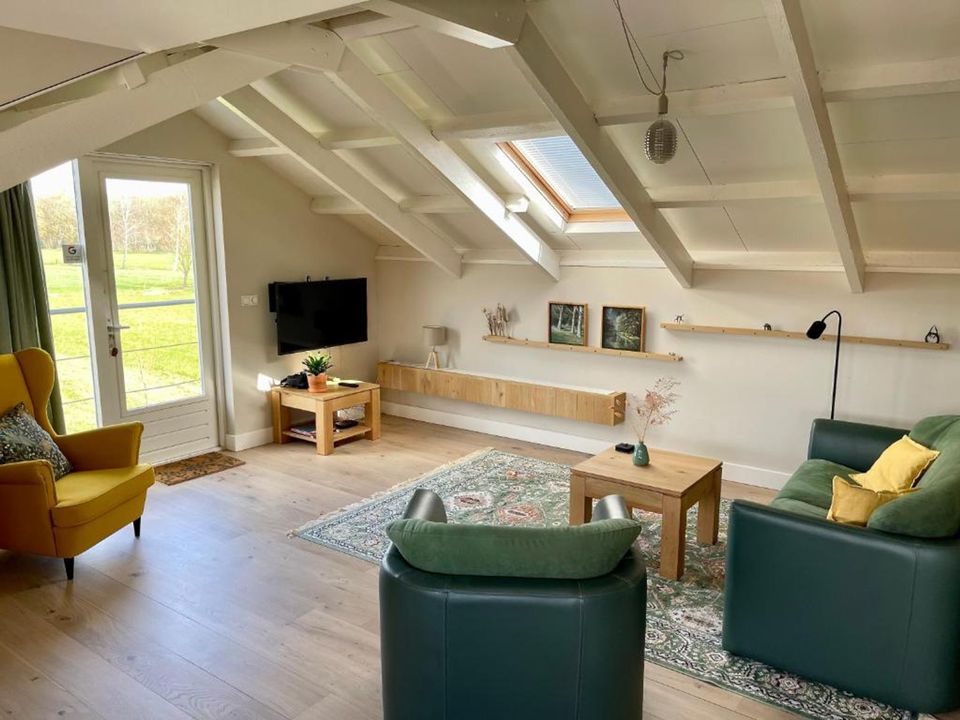 You enter an attractive and spacious room with a sitting area with TV and radio. The open space has a dining area with a view of the horse stables, farmlands and the forest and a fully equipped kitchen including a dishwasher, refrigerator, Nespresso machine and induction hob. In the nice bedroom you will find 2 single box springs that can be pushed together if desired. Opposite the bedroom is the bathroom with a rain shower, toilet, sink and a washing machine (for use when staying > 1 week). From the sitting room, just like from the dining area, you have a nice view and you look out over the farmlands, the forest and the pool. At the pool you can relax on the relax chairs or take a refreshing dip yourself.