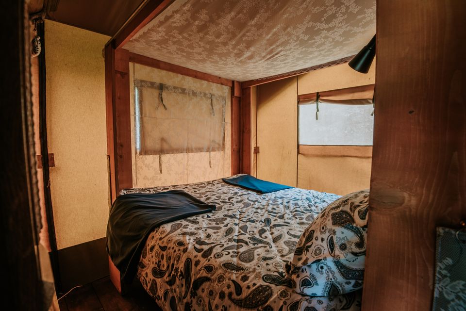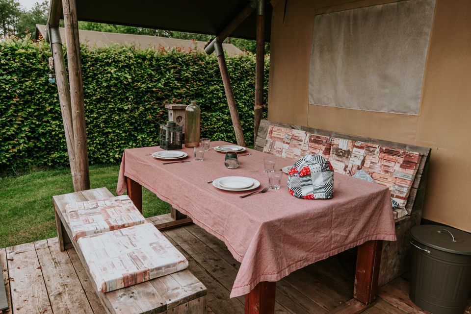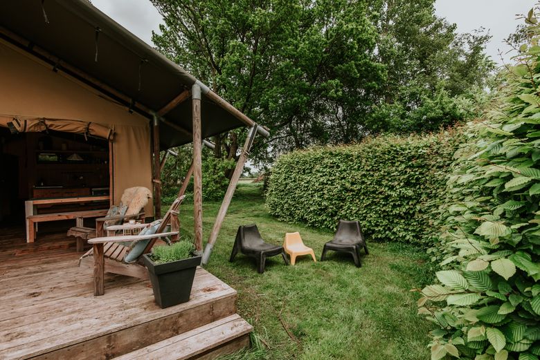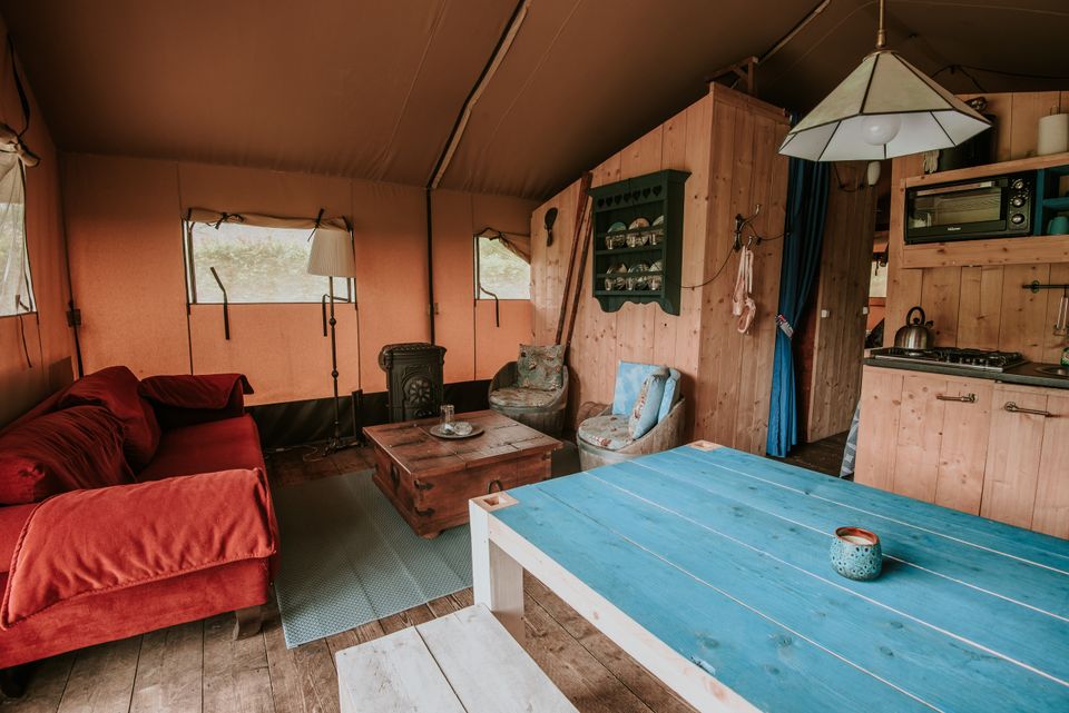 'The Titanic' is a beautiful large safari tent suitable for up to 7 people. The tent is decorated in cheerful blue atmospheres and equipped with every convenience. There is a double bed, a bunk bed, three single beds, a rain shower, separate toilet and fully equipped kitchen. If the evening is cold, there is also a nice gas heater that can be turned on. There is also a beautiful veranda in front of the safari tent where you can sit in relaxing chairs. This is the ultimate destination for a larger group.
