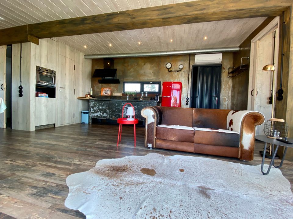 Sleeping in an old sea container, it's possible in this glamptainer! When you step inside you will be amazed by the space this glamptainer has. Everything has been thought of; a spacious living room, cozy dining area and well-equipped kitchen. There are even two bedrooms and a spacious bathroom! Here you can really enjoy your holiday. Around the glamptainer is a terrace with parasol, so you can choose whether you sit in the sun or the shade.